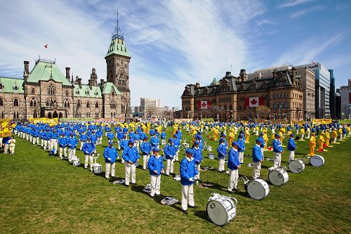 【明慧网二零一四年五月九日】(明慧记者章韵渥太华报道)二零一四年五月七日,来自加拿大渥太华、蒙特利尔、魁北克、多伦多等地的法轮功学员,汇聚加拿大首都国会山前,以天国乐团遊行、集体炼功、腰鼓队、歌舞等形式,庆祝法轮大法弘传世界二十二周年。