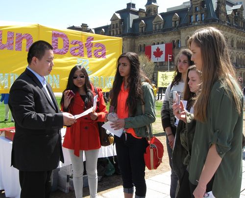 早上七点开始,法轮功学员就已经在加拿大的首都渥太华各街口给上班的路人讲真相,九点前已来到了国会山庄前给在这上班的政府官员展现大法的美好。