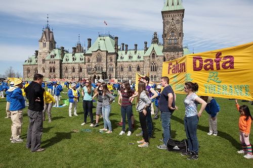 二零一四年五月七日,法轮功修炼者在加拿大首都国会山前,庆祝法轮大法弘传世界二十二周年。