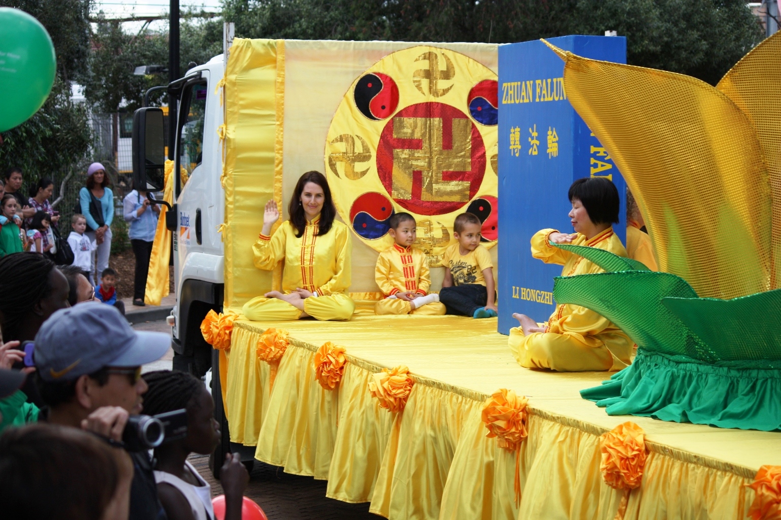 当队伍经过主席台时,台上坐着的市长、联邦议员、省议员及所有市议员、官员们都报以热烈掌声,有的挥手致意。主席台旁的主持人向观众介绍:“法轮大法也叫法轮功,是通过打坐和炼功增进身心健康的中国传统的自我修炼功法。倡导宇宙真、善、忍特性,该功法祥和、和平,遍及世界一百多个国家,全世界上亿人修炼法轮功。五套功法简单易学,免费教功……”