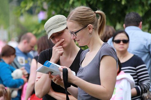 ![]() 很多居民在为法轮大法学员的游行队伍喝彩之余,接受并仔细阅读法轮大法的资料 |