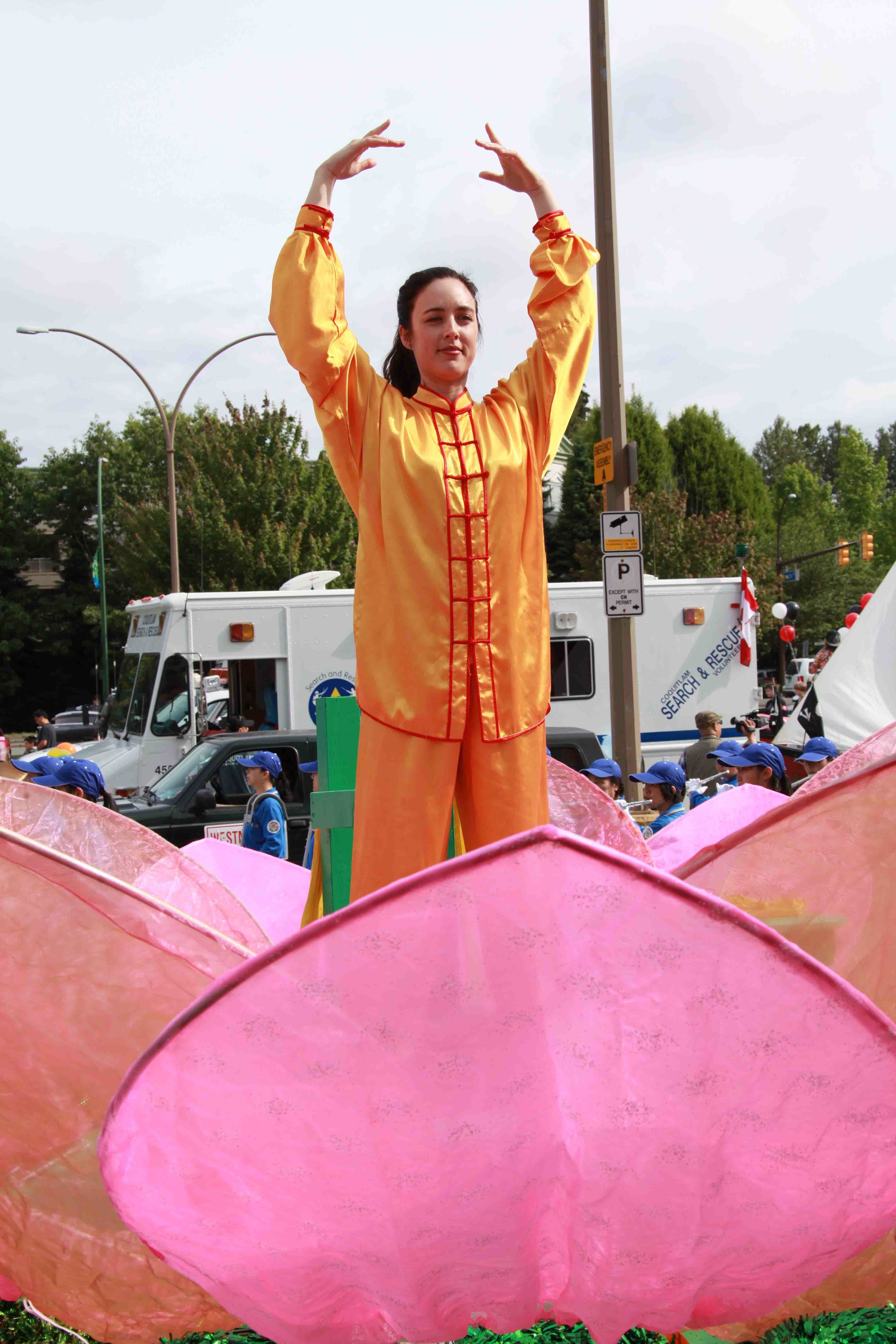 当法轮大法学员的游行队伍走过主席台时,游行主持人Tom McDonald先生介绍说,法轮大法是中国传统功法,信仰“真善忍”的理念,可以使修炼者身心健康,已经弘传世界100多个国家。法轮大法的游行队伍真让人惊叹,那美丽的花车,象莲花盛开,充满祥和,让人喜悦。那充满活力的腰鼓队在用中国传统的方式在庆祝,他们太出色了。