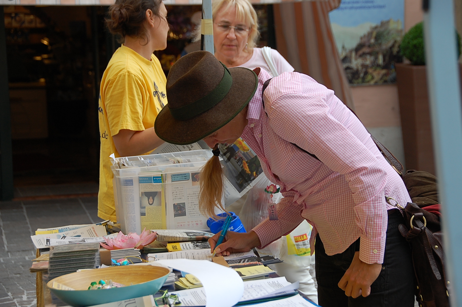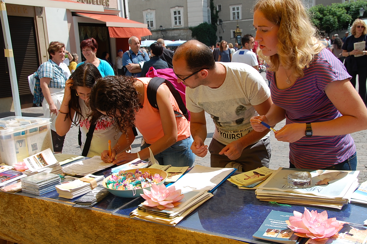 图1-2:奥地利法轮功学员在萨尔斯堡市中心广场设立真相点,传播法轮功真相。