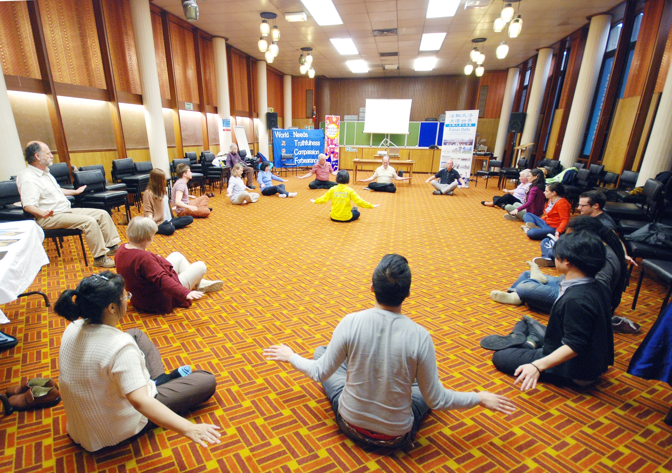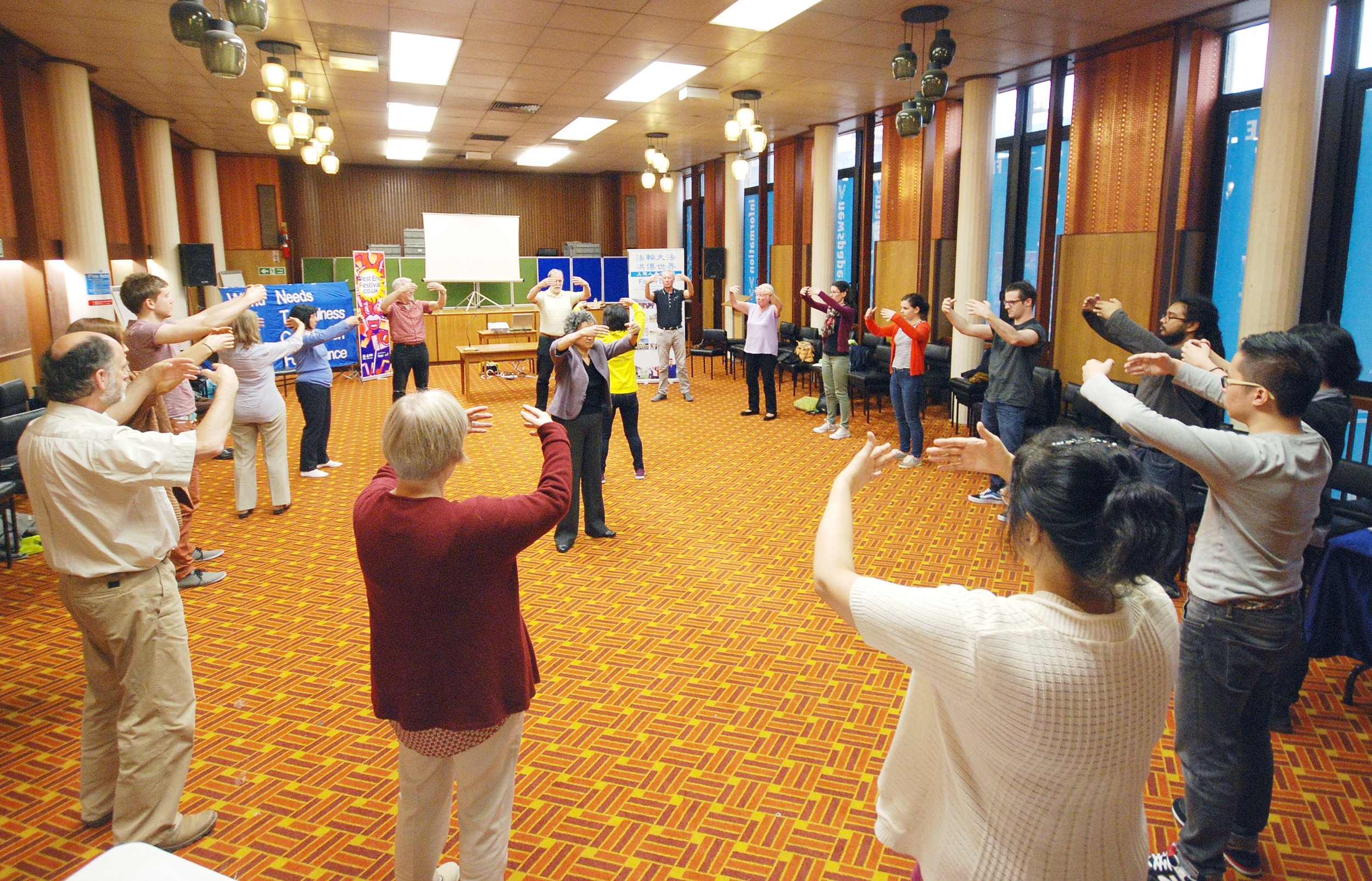 影片放映之后,来宾们站成圆形,在学员的示范和讲解下学习法轮大法的五套功法,气氛祥和。在离开之前,来宾们主动在征签表上签名,表示对中共暴行的谴责和对法轮大法修炼者道义上的支持。来宾们拿了传单和令他们欣喜的小莲花。有人询问炼功点的地点和时间,有人想订购《转法轮》。在调查问卷上,来宾写到:“这次活动很让我感动”,“提供的信息非常丰富”,“个人的亲身经历对我们了解(一个真实的)中国很有帮助。”