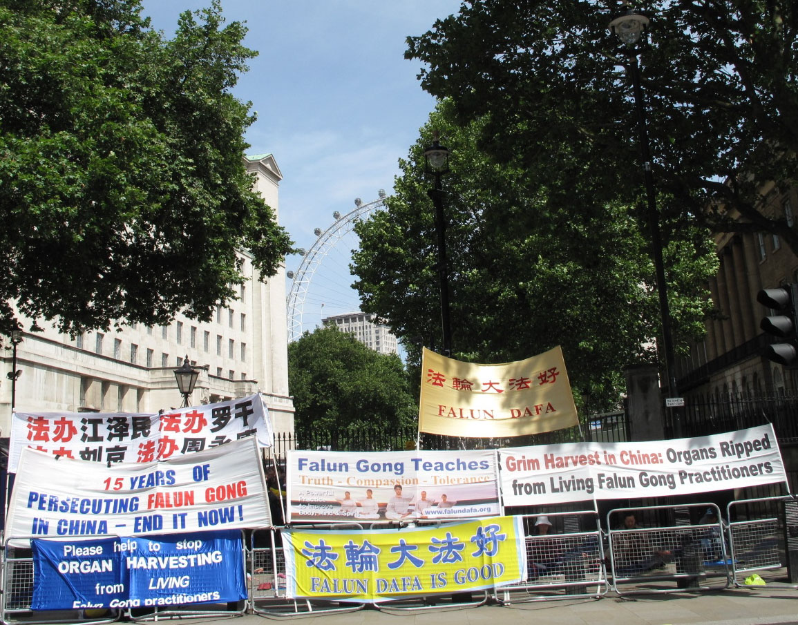 “面对中共活体摘取器官,你还沉默吗?”在当天的和平抗议中,法轮功学员打出的这个横幅队伍直接面向中共的“欢迎队伍”,而英国法轮功学员李•豪尔(Lee Hall)很长时间站在该横幅后面。他说:“我相信英国政府知道(中共迫害法轮功)这件事,副首相尼克•克莱格日前(对英国媒体)谈到在中国存在大规模系统性的人权侵犯,我希望英国政府能在公开场合对法轮功在中国遭受的迫害发声。”