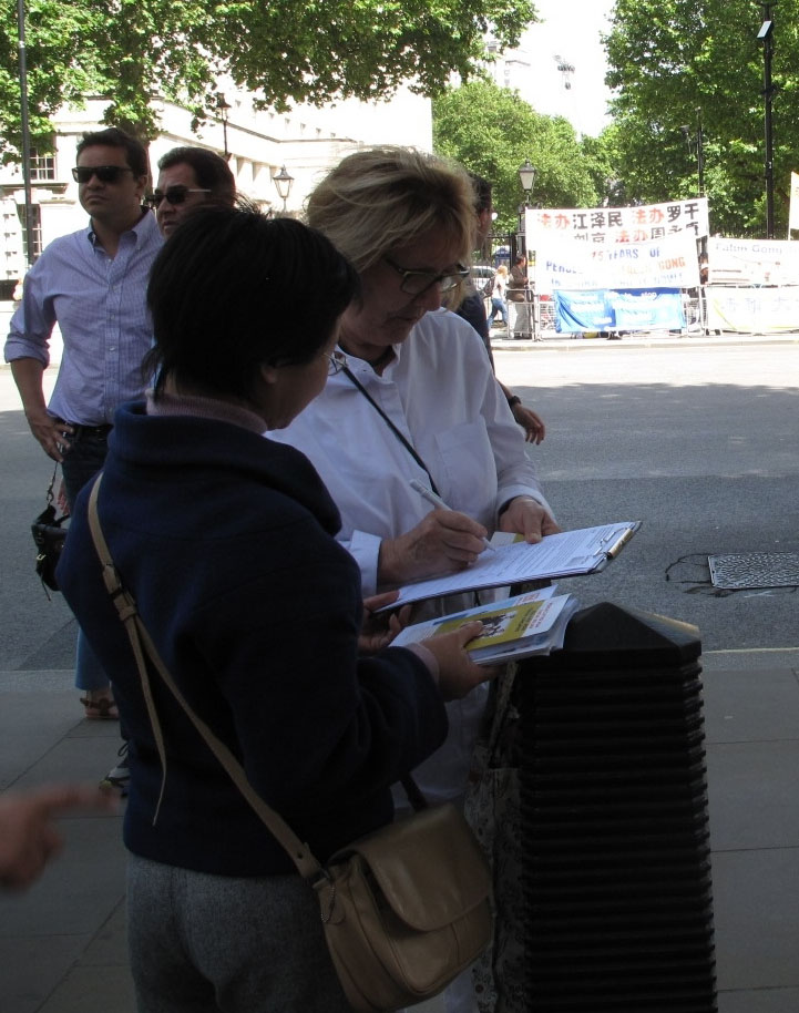 ![]() 六月十七日下午,路过唐宁街大门外的英国女士杰西(Jesse)在反活摘征签表上签名。 |
