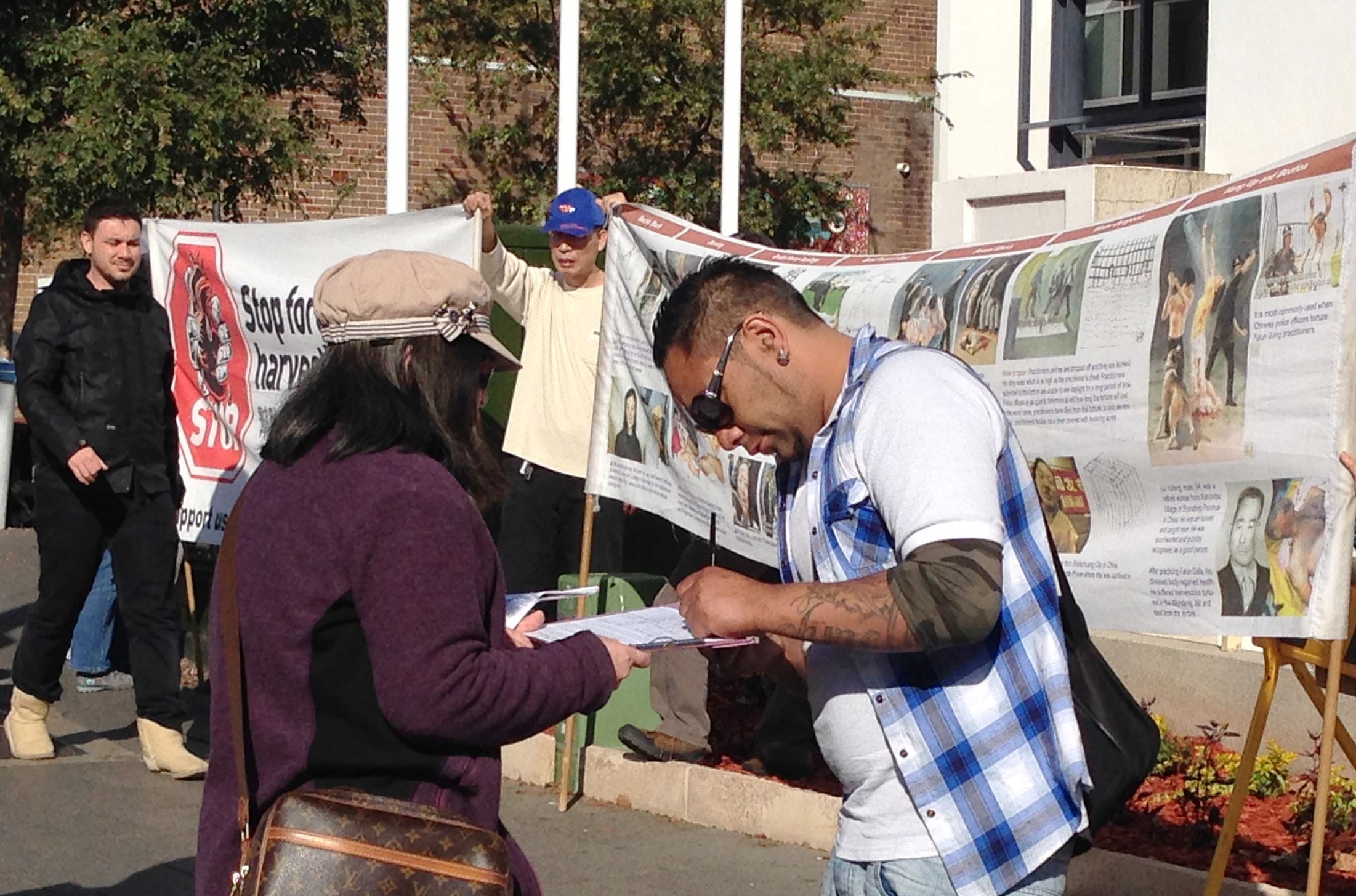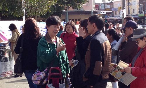 还有一位刚从北京来澳看望子女的女士,主动找到义工询问这是什么活动。义工告诉她,我们是法轮功学员,在揭露中共邪党活摘法轮功学员器官的真相。这位女士小声告诉义工,在北京的法轮功学员是会被抓捕和遭到迫害的。义工进一步向她讲述了迫害真相后,她很高兴地同意“ 三退”,在询问了如何学炼法轮功功法。得到回答后,她高兴地离开。