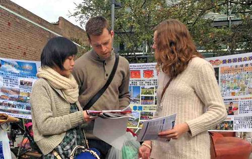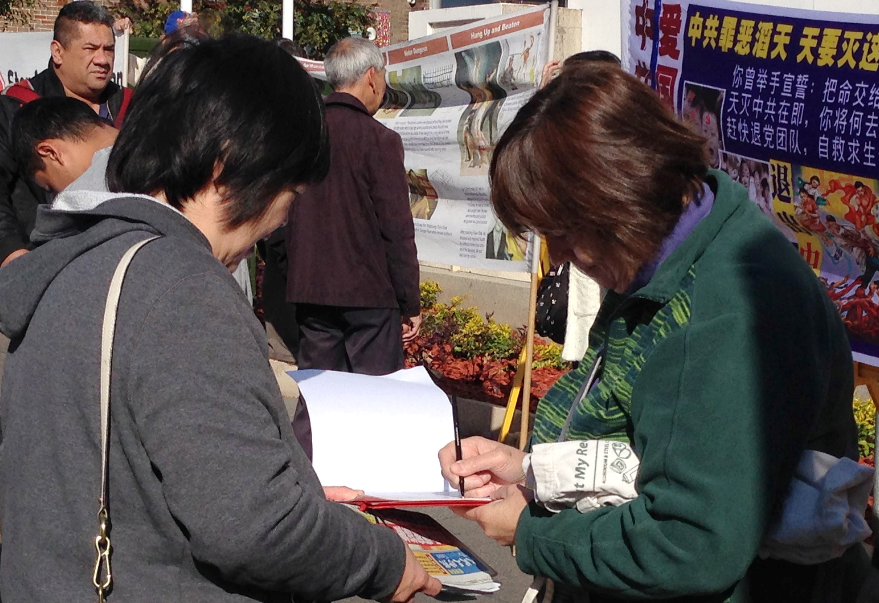 有一位从重庆来探亲儿子的五十多岁的女士,向“三退”义工拿了各种真相资料后,告诉义工,她在中国用“翻墙”网站经常看“明慧网”和“大纪元网站”,并了解到法轮功是非常好的修炼团体,如果在海外她一定要修炼法轮功。而在中国环境很恐怖,如果几个人在一起讲关于这些事,可能就会被抓了。最后她请义工帮她和她的儿子一起做了“三退”才离去。
