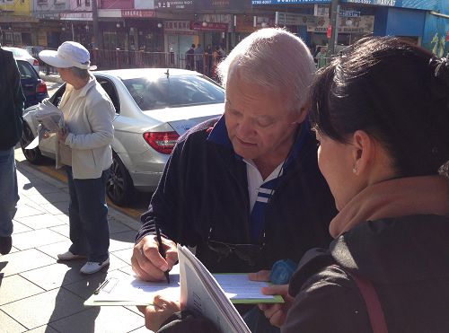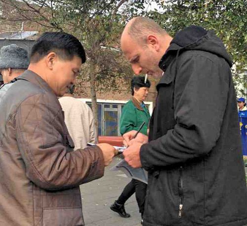 有一位上年纪的西人特地走过来对学员说,他已经签过名了,他非常支持法轮功学员反迫害。他说,你们做的是对的。共产党太邪恶了。他并表示自己一直在为那些遭受迫害的中国人祈祷。
