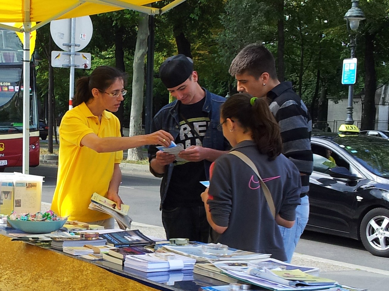![]() 图1-2:维也纳玛利亚特蕾西亚广场上,人们驻足了解法轮功真相 |