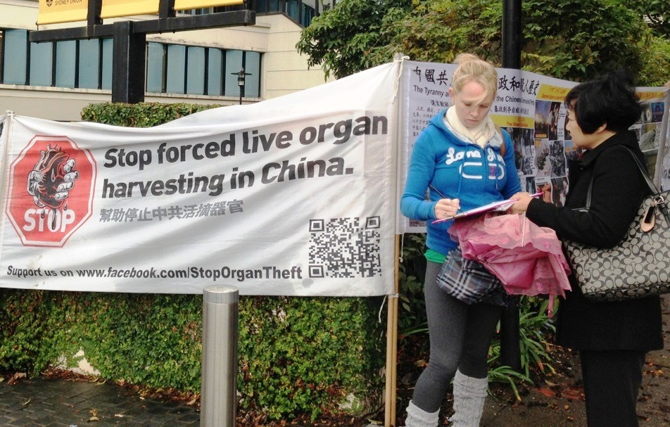悉尼大学学生Grace刚从巴士下车,看着真相横幅,嘴张得大大的,整个人惊呆似地定住在那里了。她从来没有听说过这么恐怖的事情,她眼含泪水问:这是真的吗?这样的事情还在发生着,太恐怖了,太邪恶了。她毫不犹豫地在征签表上签名支持制止这种罪恶。