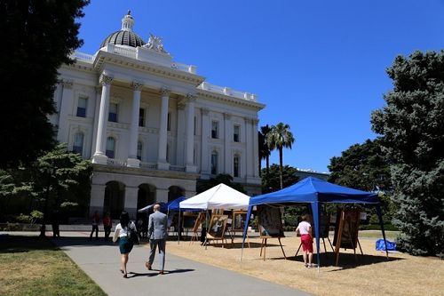 二零一四年六月三日和四日,美国加州首府沙迦缅度烈日当空,在州议会大厦北草坪上的艺术展--“真善忍美展”,依然吸引不少西装革履、穿着正式的上班一族,顶着酷暑高温观看。