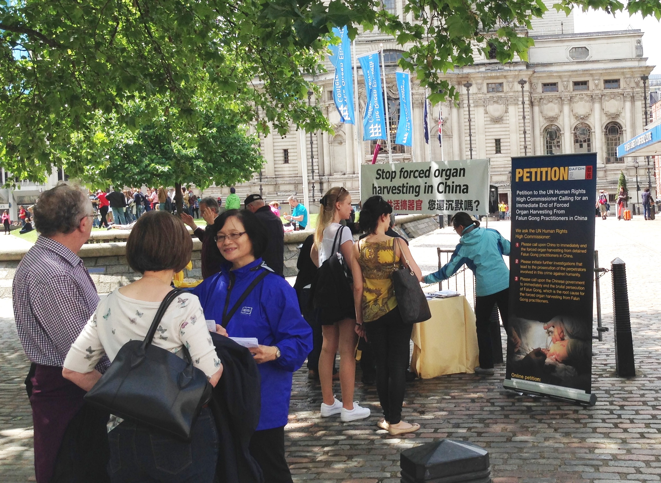 这是英国法轮功学员借伦敦召开国际移植大会的机缘,让更多世人感受法轮大法的美好,并把中共大规模活摘法轮功学员器官的反人类罪行公布于天下,呼吁国际器官移植界和全民一起谴责中共暴行,共同制止迫害