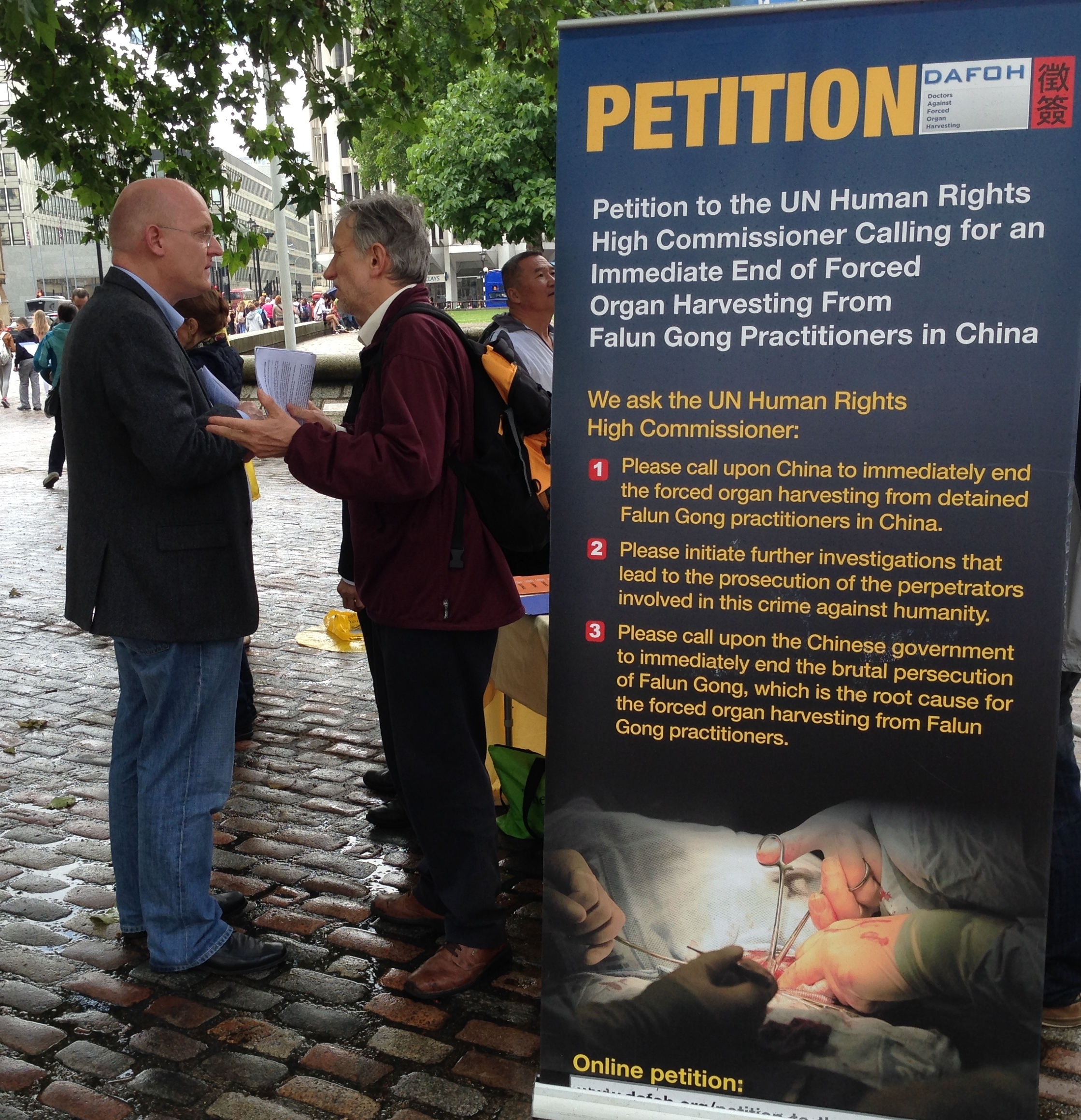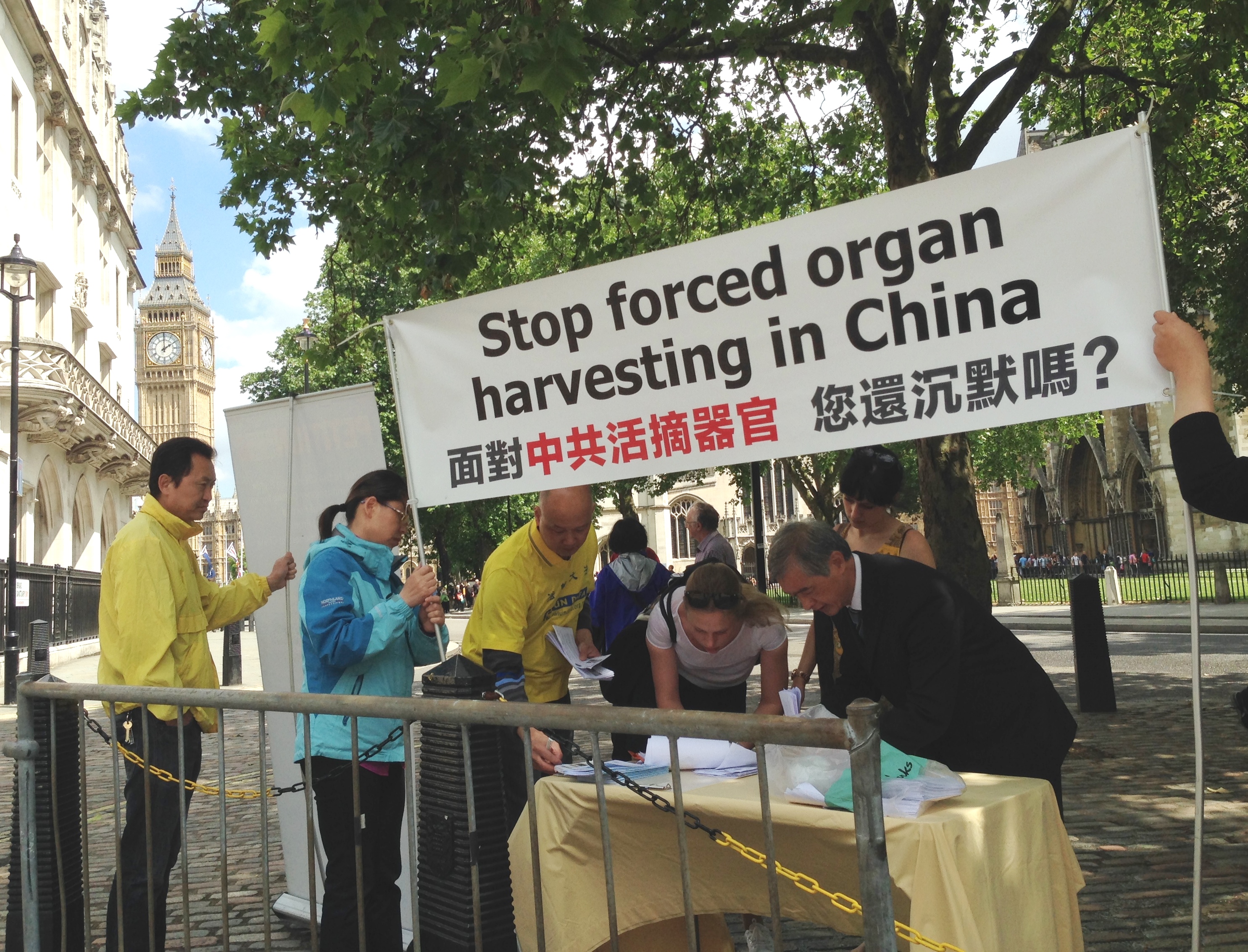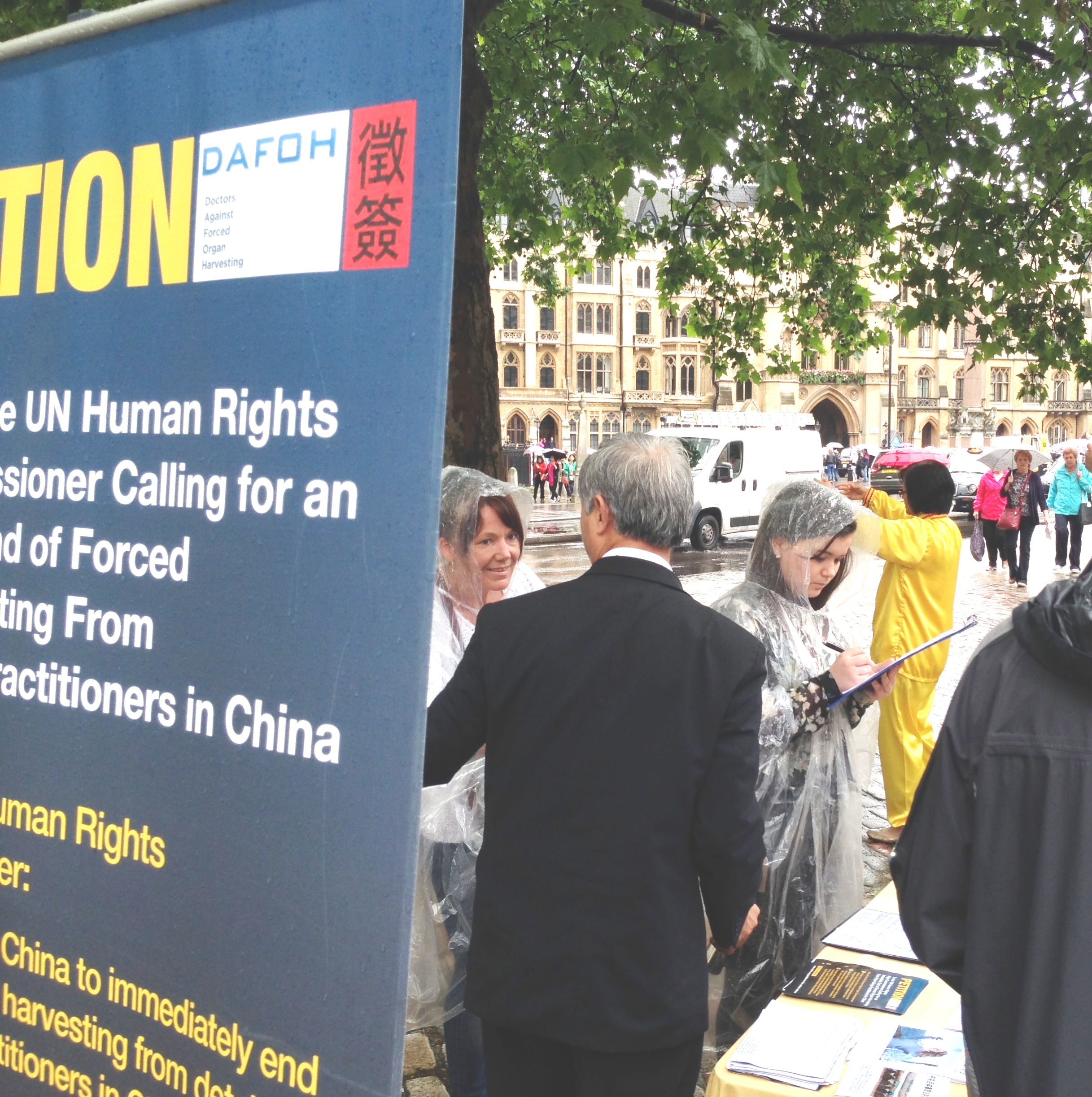 伦敦国际移植大会期间,约三百位出席此次会议的代表在反强摘征签表上郑重地签下自己的名字。法轮功学员注意到,几位前几天一直没有签名的代表在会议结束离开会场的路上,路过法轮功学员的活动场地时,也拿起笔签下了自己的名字。