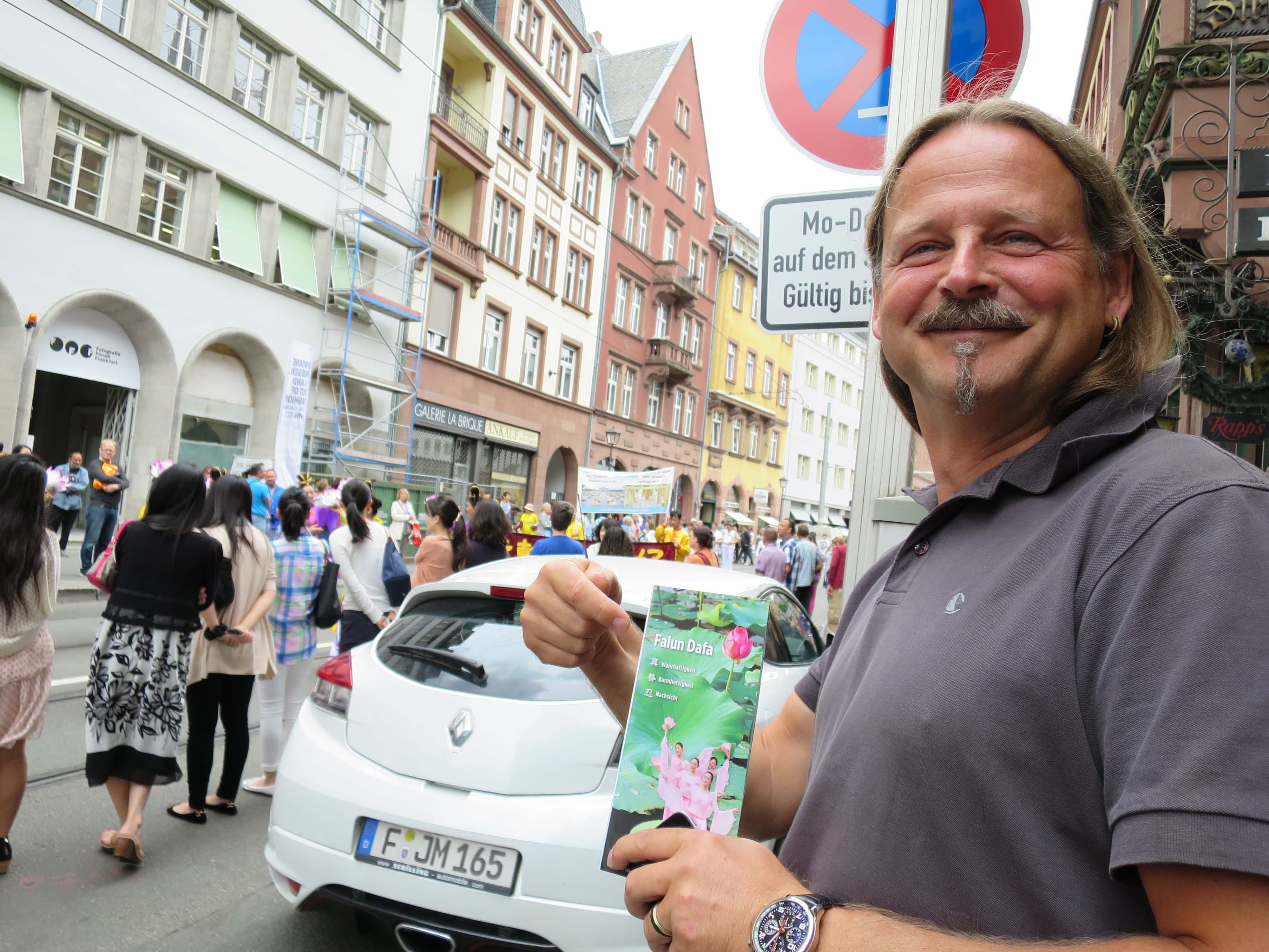 当法轮功学员队伍经过主席台时,主持人介绍说:“这是十年来每年都参加的法轮大法的队伍,他们用西方的乐器奏出中国的音乐,非常有风格,为法兰克福地区的文化做出贡献,让这里的文化生活多姿多彩。”同时主持人也提到法轮功在中国遭受的迫害。