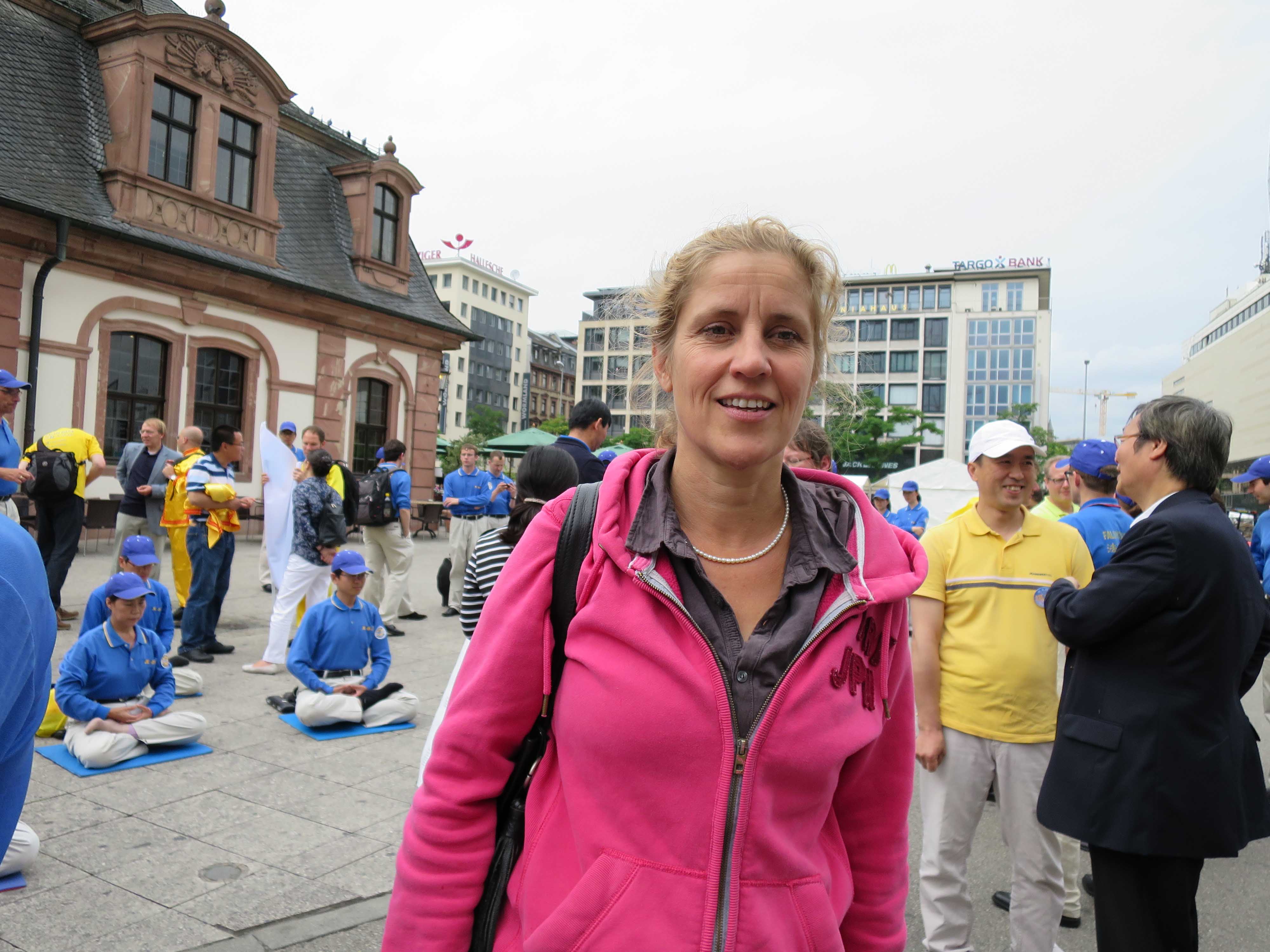 一位德国中年女基督徒在看到法轮大法游行队伍之前没听说过法轮大法和在中国遭受迫害的真相,在跟法轮功学员交谈之后,她了解到法轮功是以真、善、忍为原则,辅以五套功法的佛家修炼法门,并在中国法轮功受到中共打压和迫害时,她表示:“谁做这样的事情(迫害法轮功)都应该受到谴责,在我看来这太可怕了,这并非上帝所愿。”