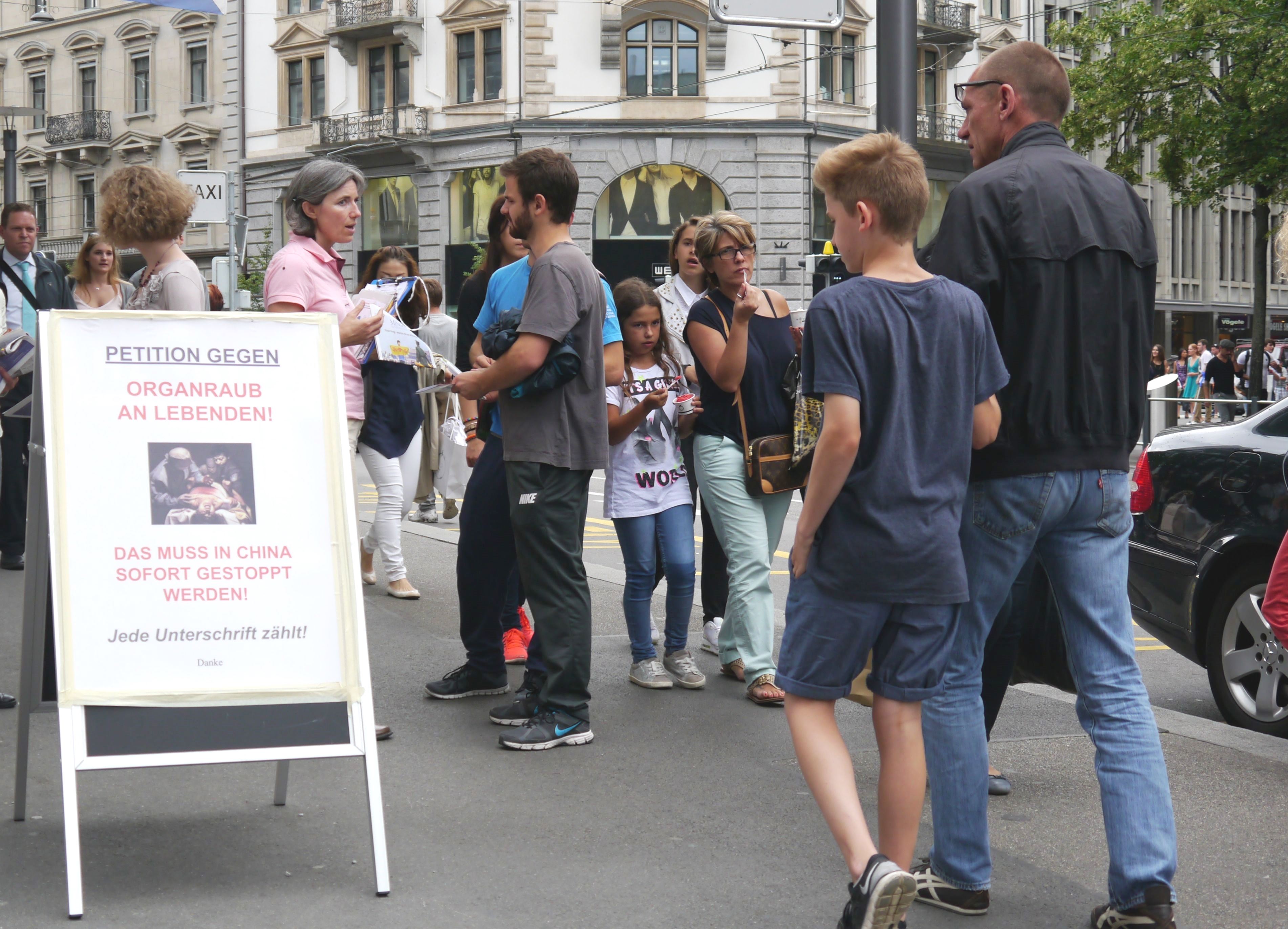 【明慧网二零一四年七月十日】二零一四年七月五日,法轮功学员再次来到苏黎世市(Zurich)繁华的班霍夫大街(Bahnhofstrasse),向民众揭露中共对法轮功的残酷迫害,并征集签名共同制止中共活摘器官的暴行。