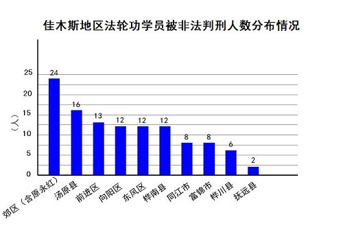 在佳木斯市所辖的四个区、两个县级市和四个县中均有法轮功学员被非法判刑;其中郊区(含原永红区)被非法判刑人数最多,高达24人;
