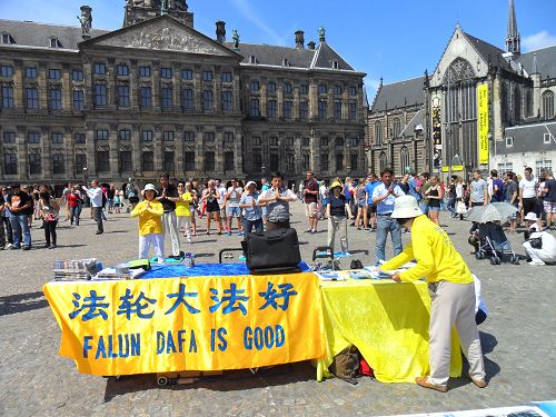 二零一四年七月十二日,荷兰首都阿姆斯特丹市皇宫门前的达姆广场上,法轮功学员集体炼功的场面和摆放的大量真相图文吸引了众多的路人。