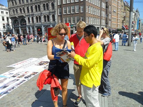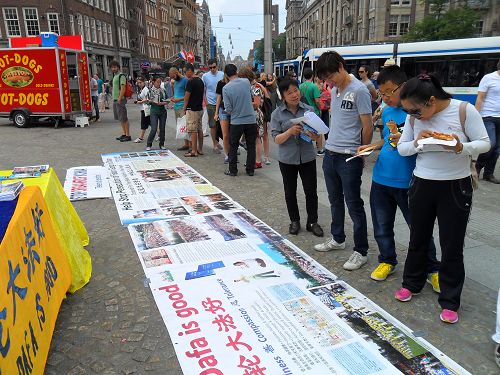 ![]() 图2-4:达姆广场上,路人阅读展板,了解法轮功真相 |