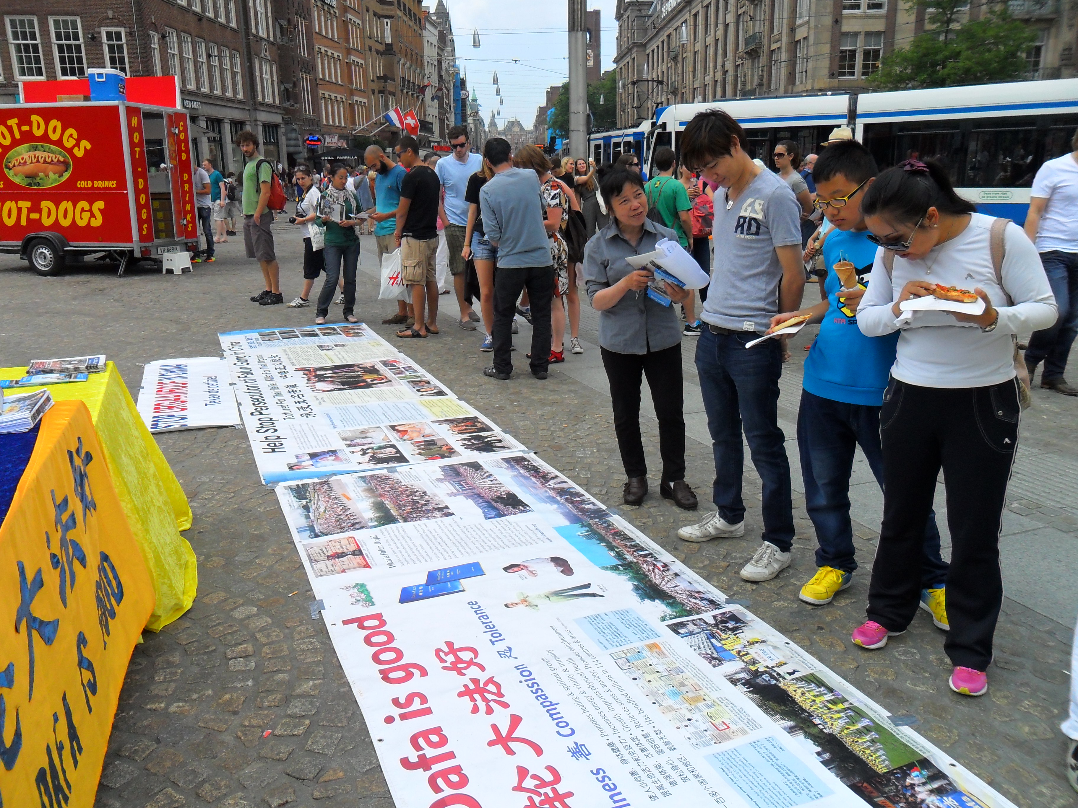 皇宫门前的达姆广场上,法轮功学员集体炼功的场面和摆放的大量真相图文吸引了众多的路人。