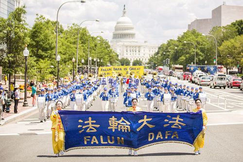 七月十七日,美国首都华盛顿特区市中心,法轮功学员浩浩荡荡的游行队伍吸引了这个世界政治之都上班族和游客的目光。“法轮大法洪传世界”、“法轮功受迫害”,以及“退出中共保平安”等主题引发人们的关注和思考。