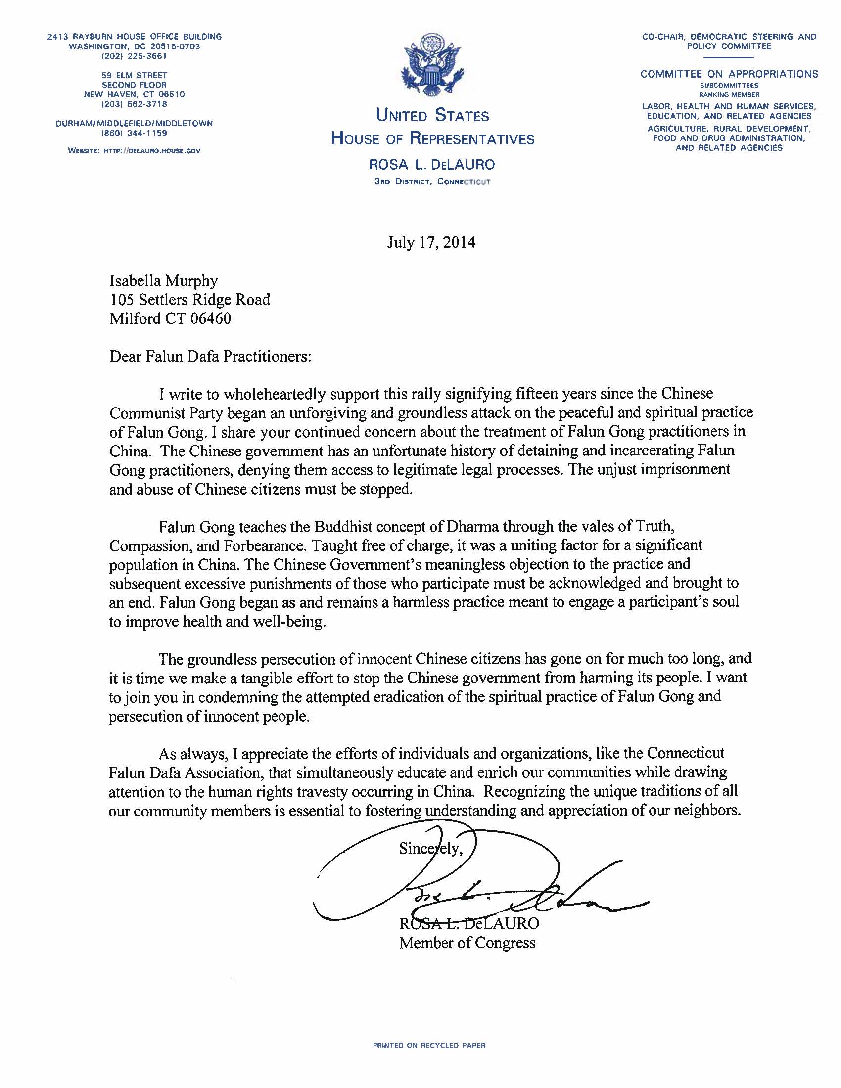 ![]() 康涅狄格州国会众议员罗莎•L•狄劳洛(Rosa Delauro) | ![]() 康涅狄格州国会众议员罗莎•L•狄劳洛(Rosa Delauro)的信函 |