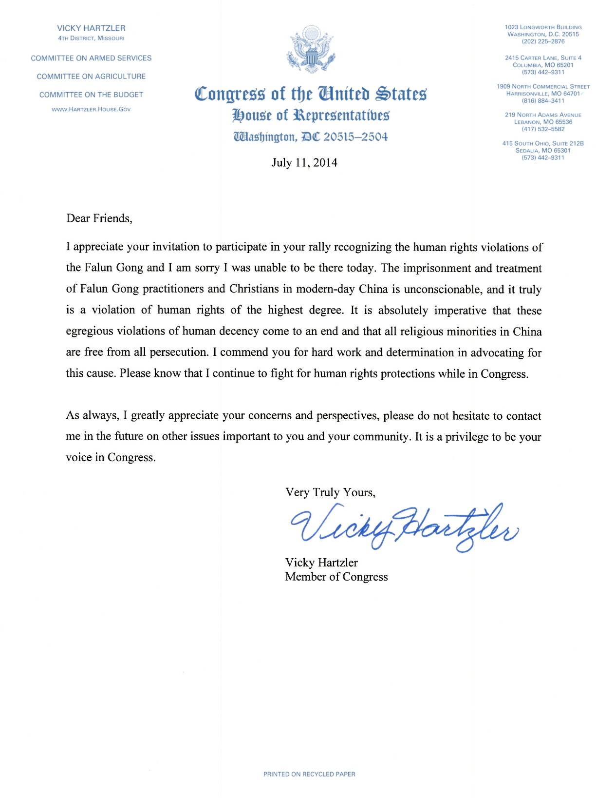 ![]() 密苏里州国会众议员维琪•哈茨勒(Vicky Hartzler) | ![]() 密苏里州国会众议员维琪•哈茨勒(Vicky Hartzler)的信函 |