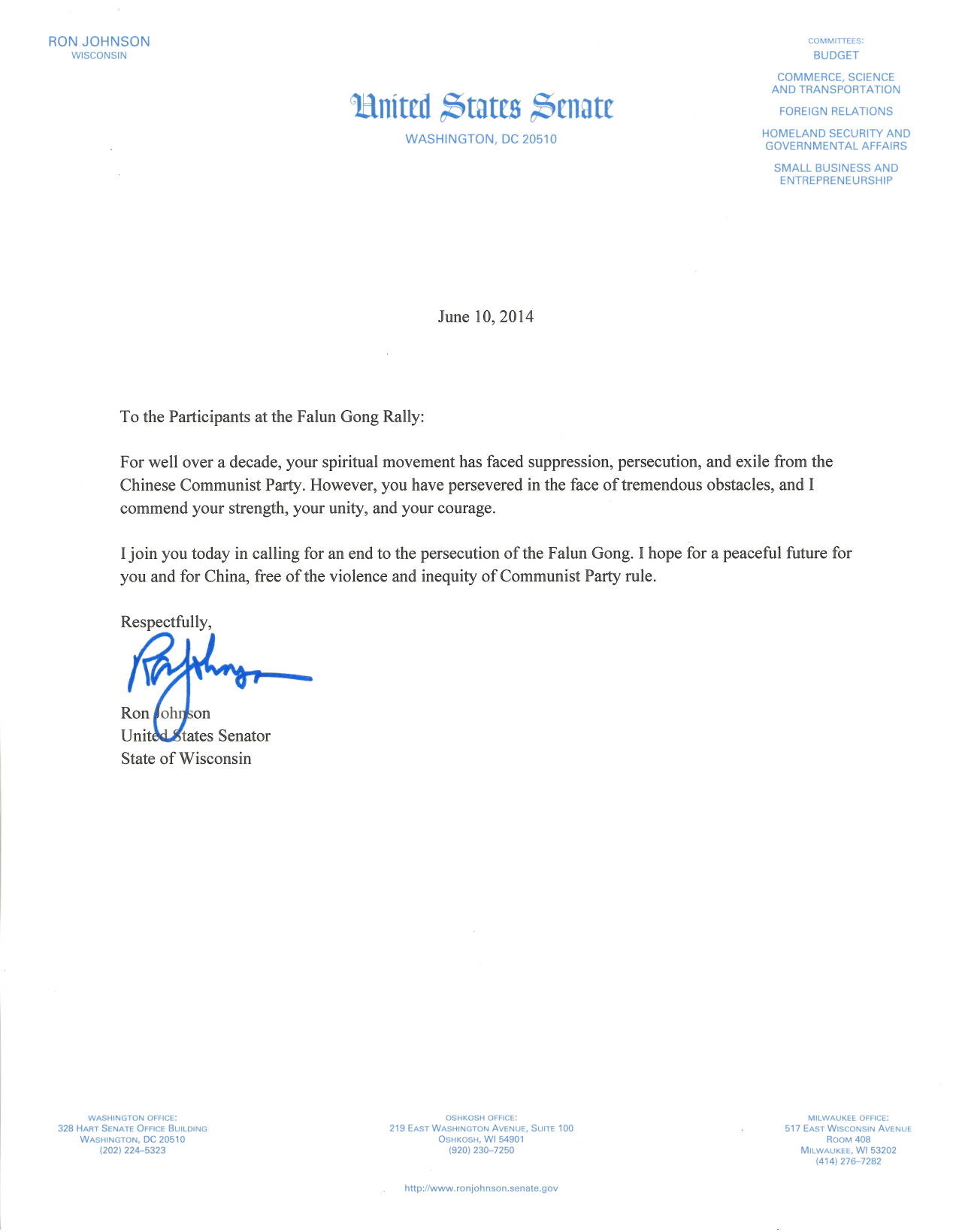 ![]() 威斯康星州联邦参议员罗恩•约翰逊(Ron Johnson ) | ![]() 威斯康星州参议员罗恩•约翰逊(Ron Johnson )的信函 |