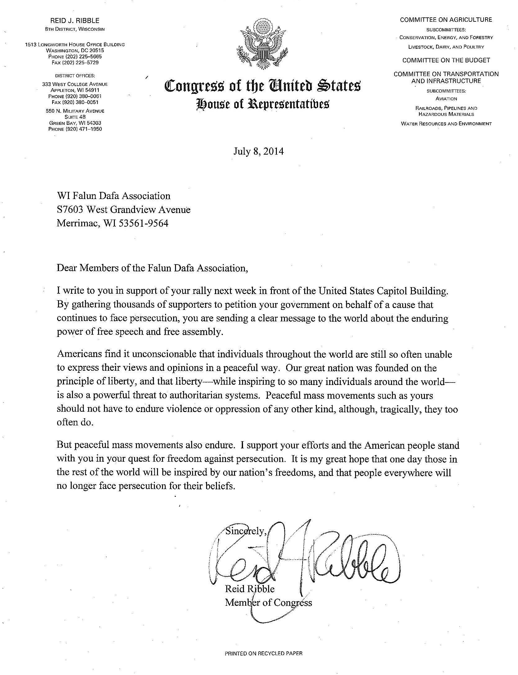 ![]() 威斯康星州国会议员里德•里布尔(Reid Ribble) | ![]() 威斯康星州国会议员里德•里布尔(Reid Ribble)的信函 |