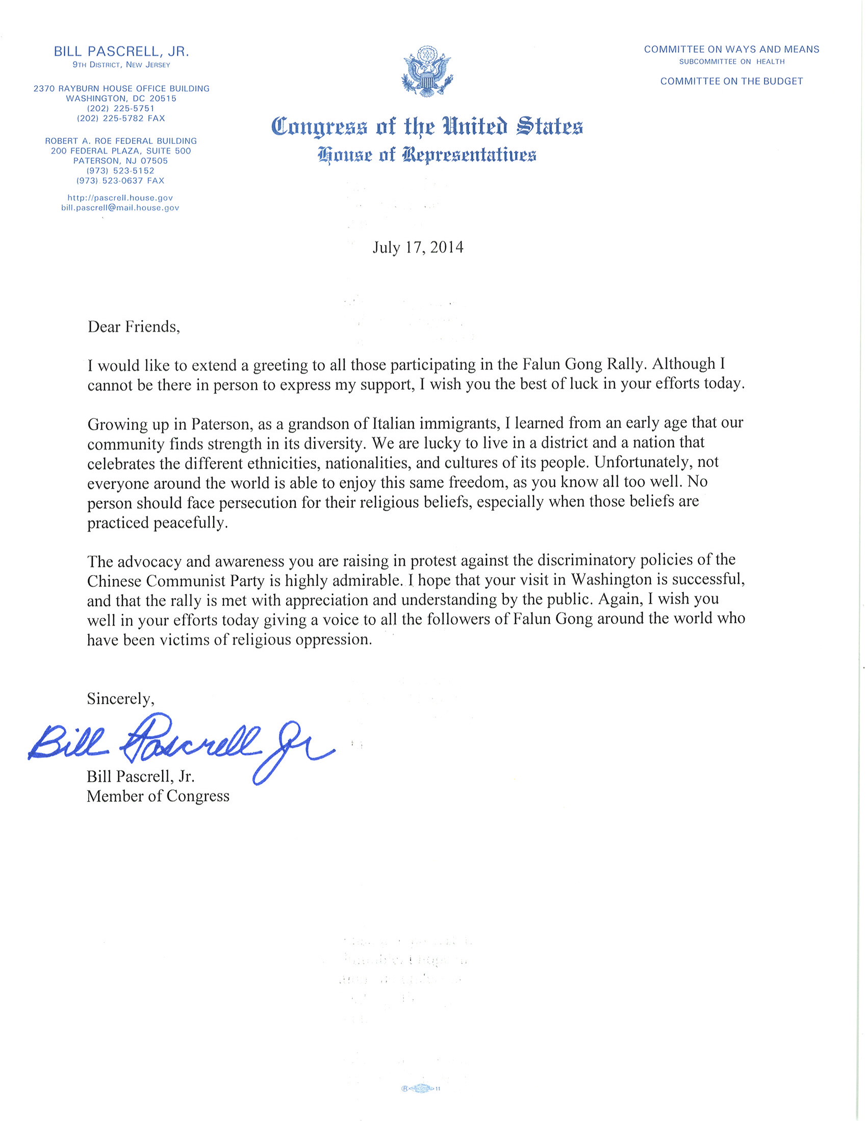 ![]() 美国新泽西州联邦众议员比尔•帕斯克瑞尔(Bill Pascrell,Jr.) | ![]() 美国新泽西州联邦众议员比尔•帕斯克瑞尔(Bill Pascrell,Jr.)的信函 |