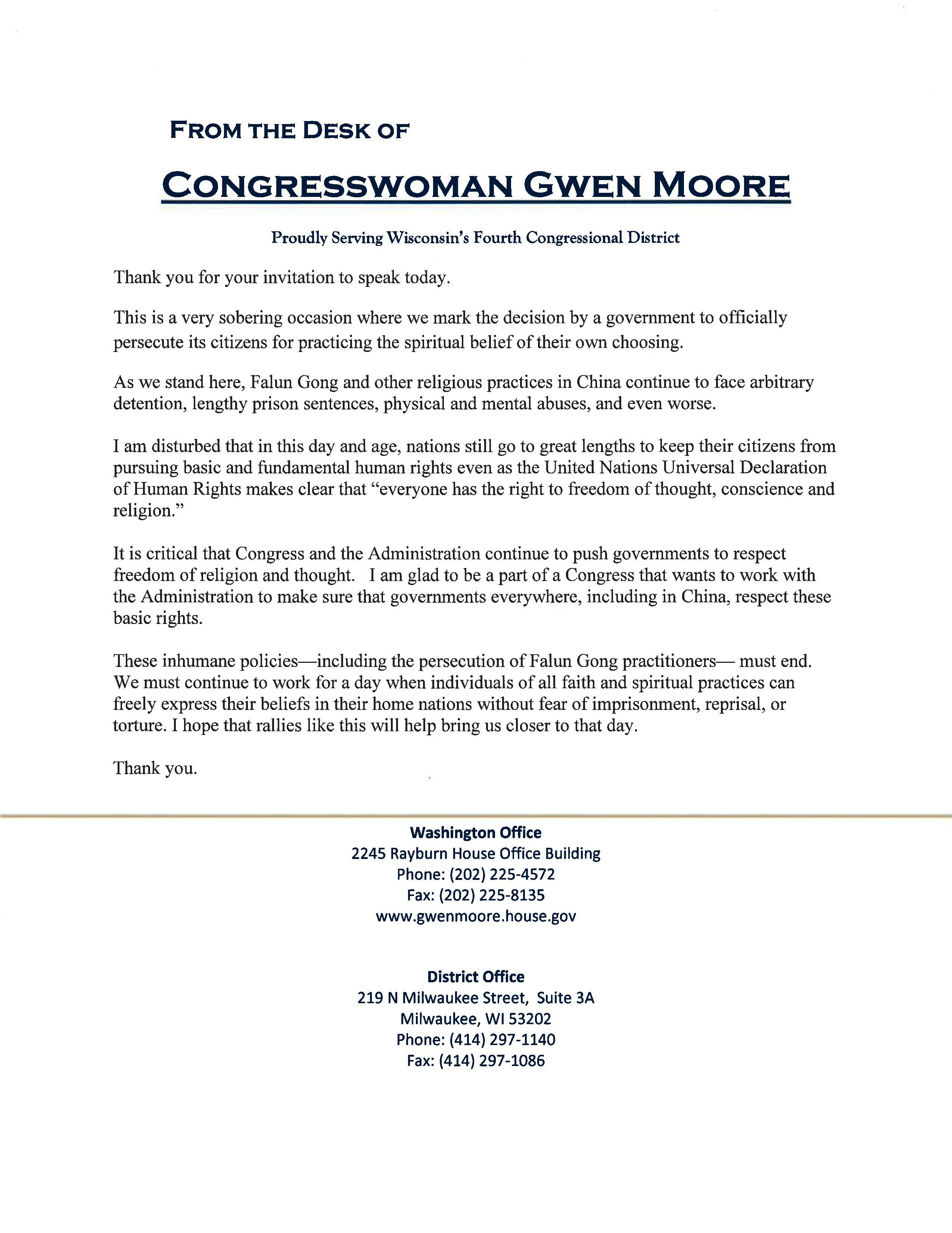 ![]() 美国威斯康星州联邦众议员格温•摩尔(Gwen Moore) | ![]() 美国威斯康星州联邦众议员格温•摩尔(Gwen Moore)的信函 |