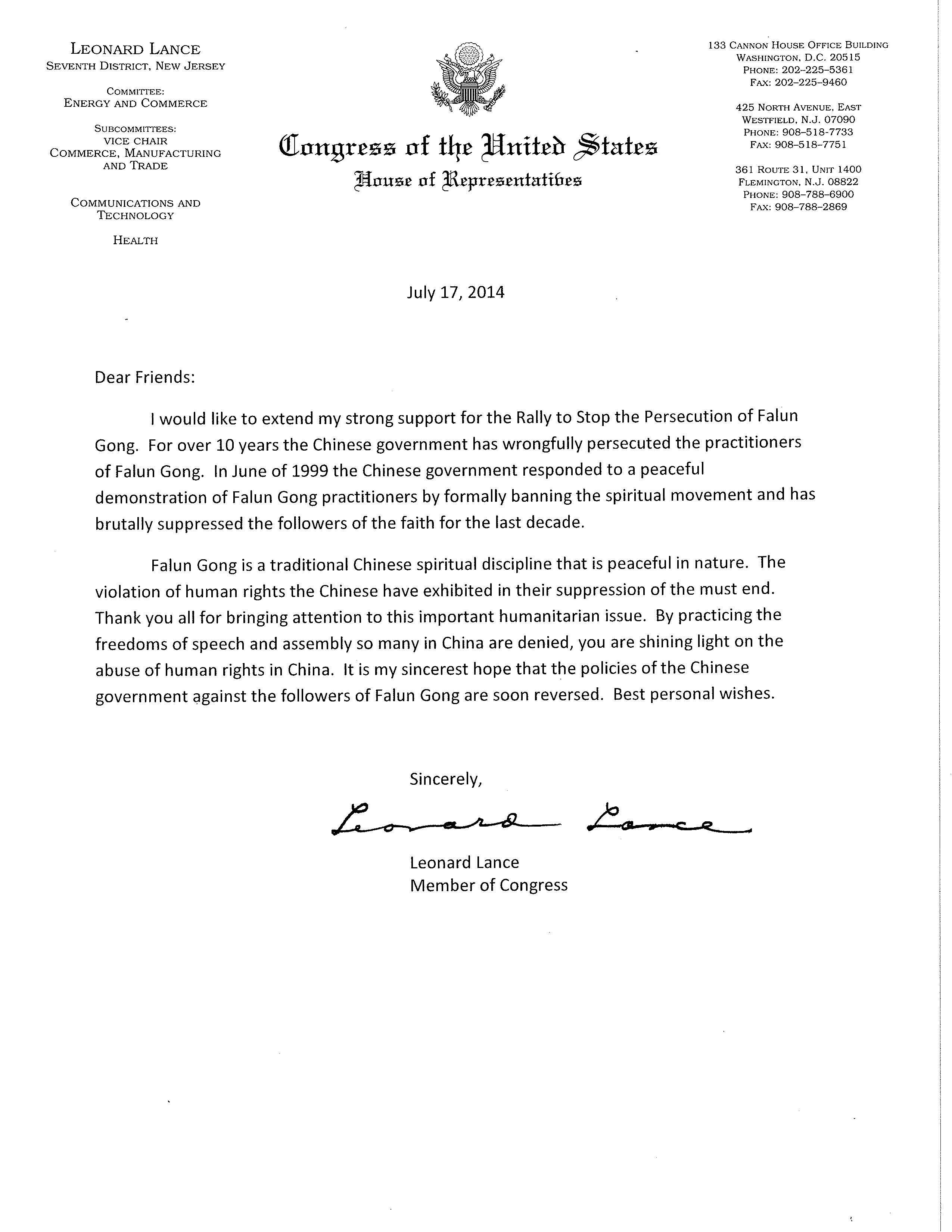 二零一四年“七•二零”前夕,多位美国国会参、众议员致函法轮功学员,他们在信中说:“十五年的迫害时间太长,现在是结束对法轮功修炼者的人权迫害的时候了”,并表示与法轮功学员一道,要求中共停止迫害法轮功。