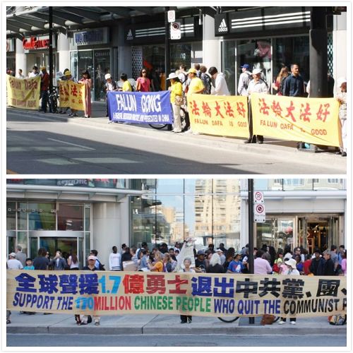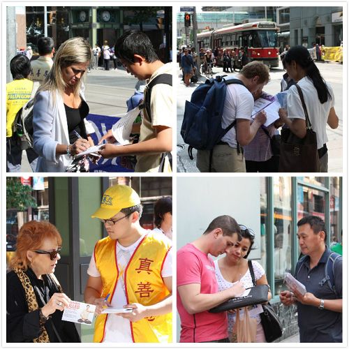 从七月十四日到十七日,多伦多的法轮功学员在市中心最繁华的几个十字街头举办真相展、征签、和制止活摘明信片征签活动;在市中心,在人流最旺的十个地铁站口向民众面对面讲真相;随后还将于周末举行大型的集会、烛光悼念活动。