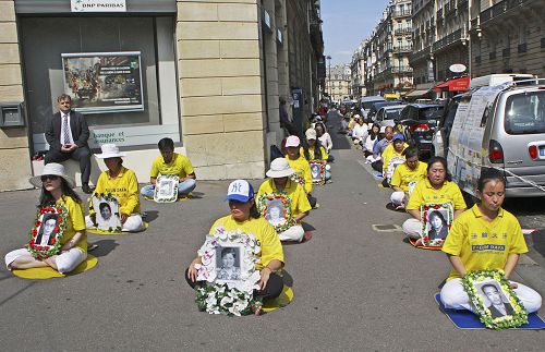 二零一四年七月十七日,法国部分法轮功学员在中共驻巴黎使馆对面举行和平集会,纪念法轮功反迫害十五周年。他们通过祥和的功法展示、真相横幅展板、广播和征签等方式呼吁制止迫害。