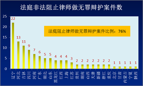 今年上半年,中国大陆共发生了至少312例处于所谓“法院审理”阶段的迫害法轮功学员的案件,其中147例迫害案件的家属聘请了约345位维权律师进行无罪辩护,其中112个案件明显存在中共法庭阻止维权律师做无罪辩护的违法行为,占样本总数的76%。