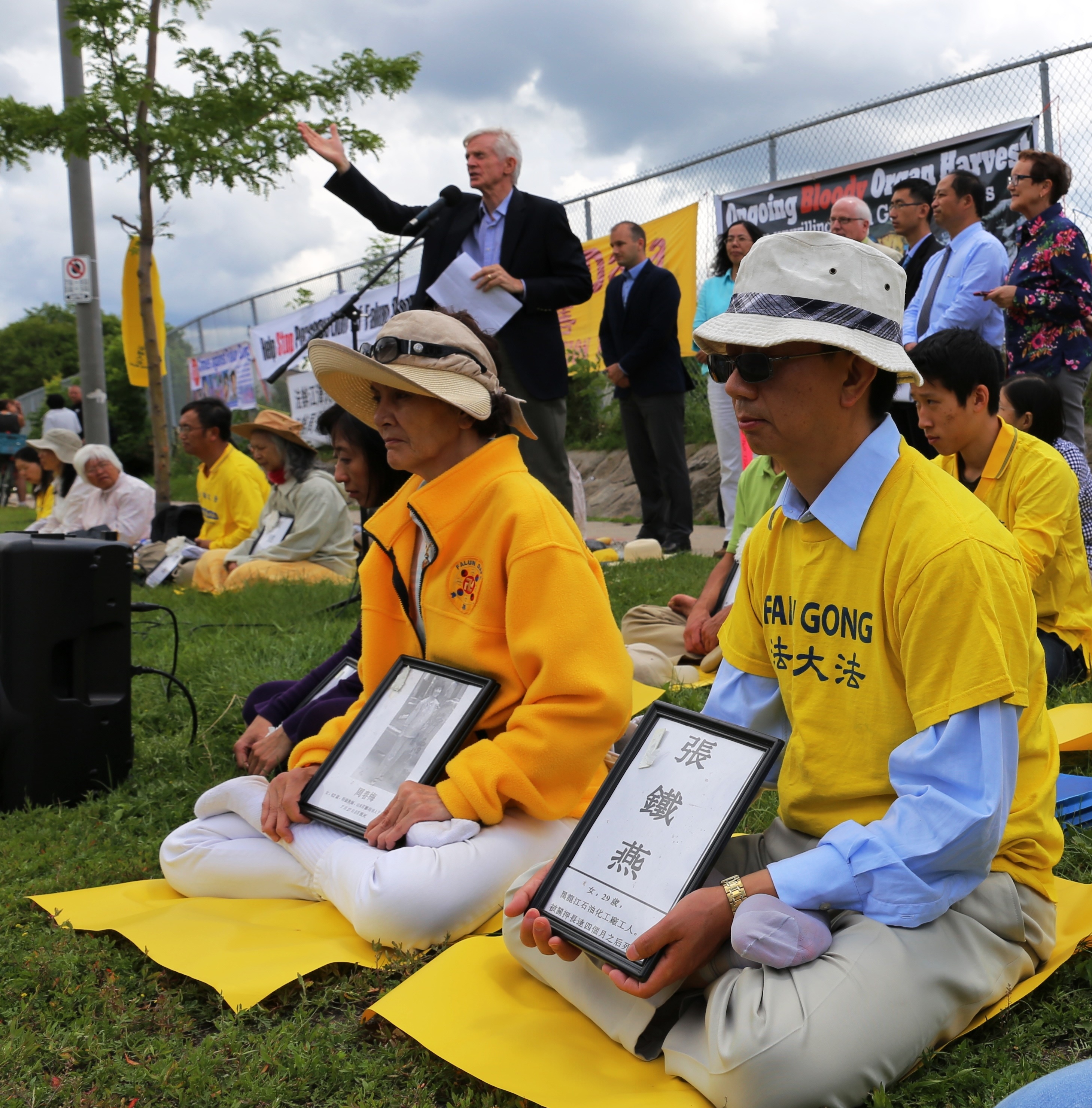 当天集会上,身着黄色衣服、和平理性地表达制止迫害诉求的法轮功学员,成为圣•凯瑟琳大街上一道的风景,一部份法轮功学员悠缓祥和的炼功动作吸引了许多民众驻足观看,许多民众主动向法轮功学员了解真相,并签名制止活体摘取法轮功学员器官。