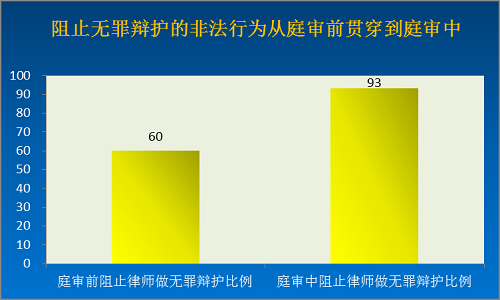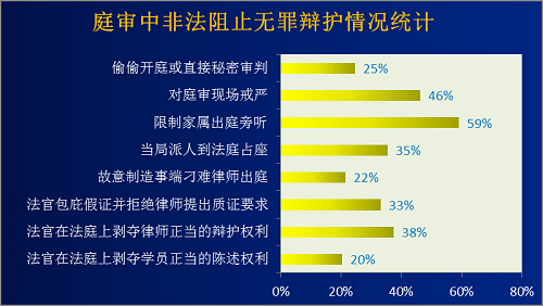 在本次调查的93个在庭审过程中采取各种非法手段企图阻止无罪辩护案件中,“限制家属出庭旁听”比例高达59%排第一,其次是“对庭审现场戒严”(46%)、“法官在法庭上剥夺律师正当的辩护权利”(38%):