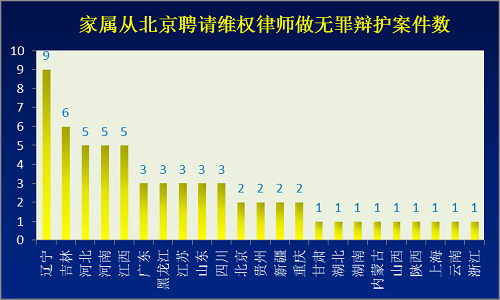 在这场围绕聘请与阻止维权律师的较量中,来自北京的维权律师无疑是其中最突出的群体。根据我们的不完全统计,在本次调查的147个有聘请维权律师做无罪辩护案件中,42%、62个案例的家属都有从北京聘请维权律师,覆盖全国23个省直辖市。也就是说,有迫害的地方,就有北京维权律师的身影: