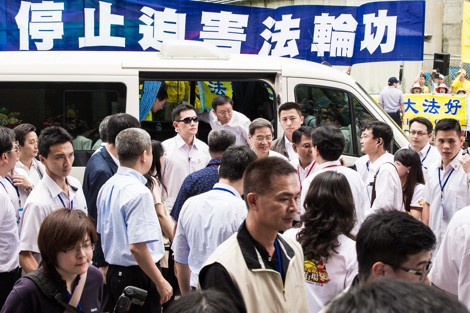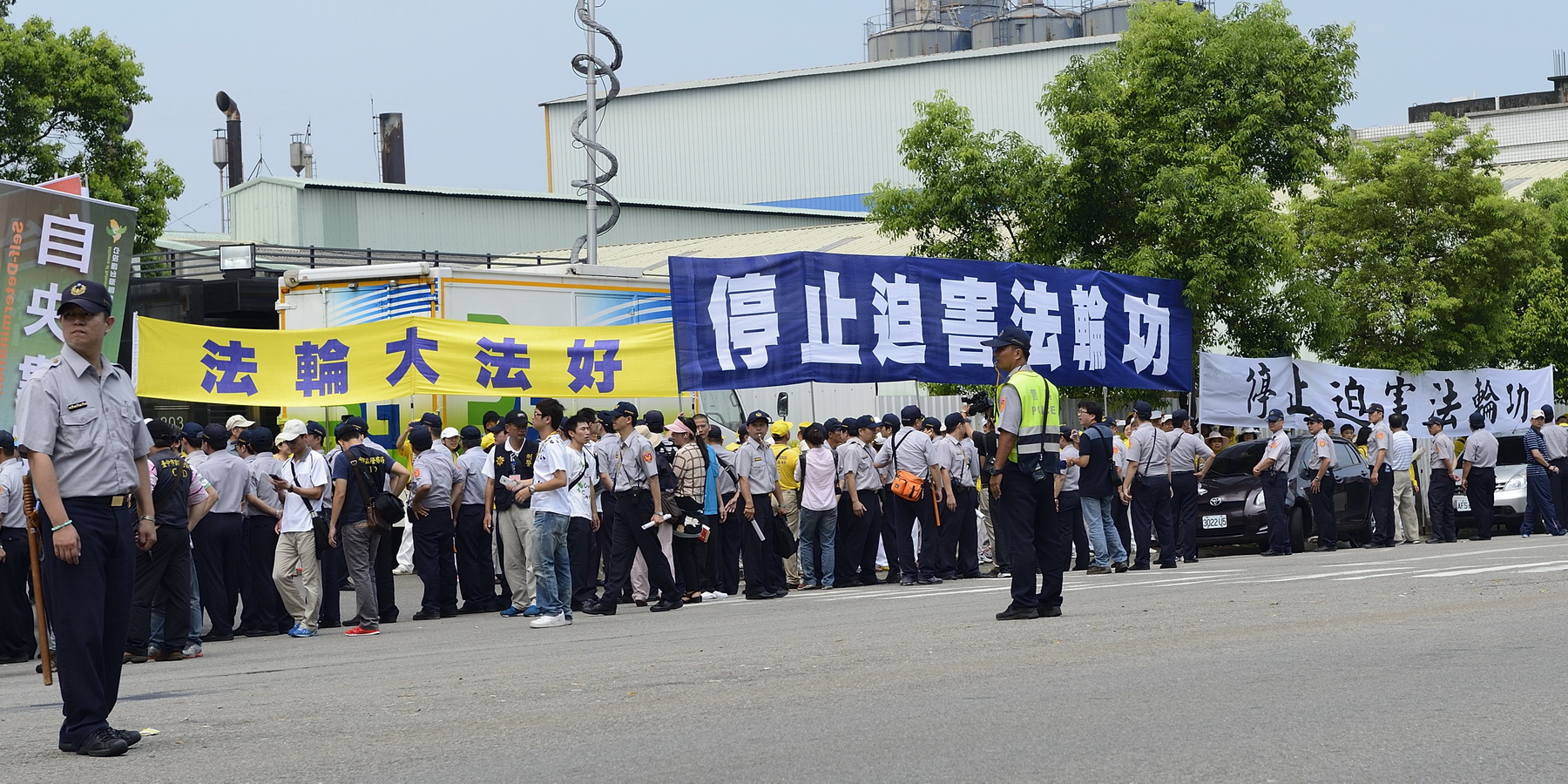 对法轮功学员坚毅、和平地表达心声,负责维持治安的台湾警察当场表示佩服,更有其他抗议团体高喊:“法轮功加油!”有的员警主动提醒法轮功学员,关怀学员的安全。被判有罪的“爱国同心会”成员张秀叶在饭店外诬蔑法轮功、并用身体刻意阻挡横幅,警方勒令他离开,到空旷地方去,不要滋事与干扰法轮功学员。