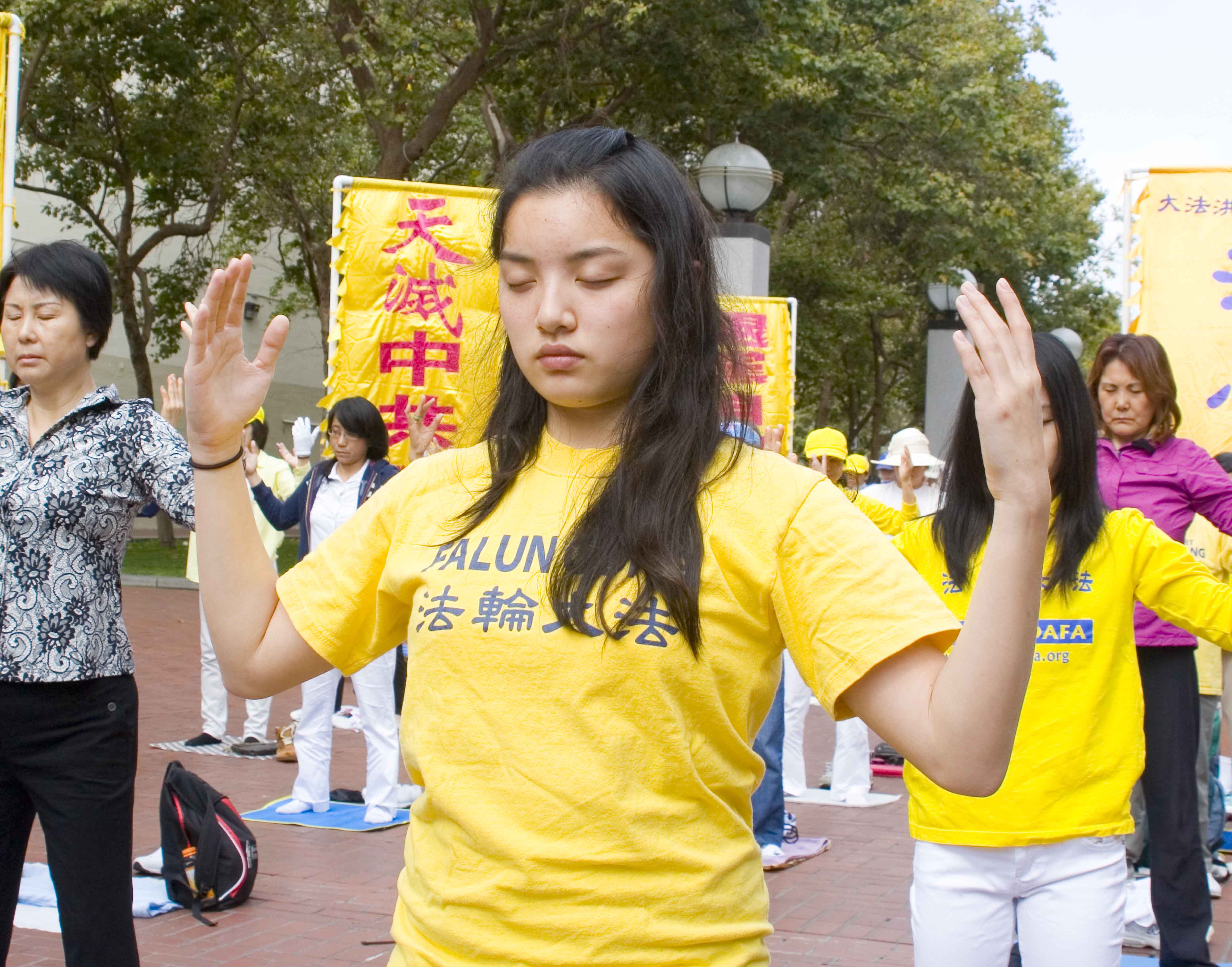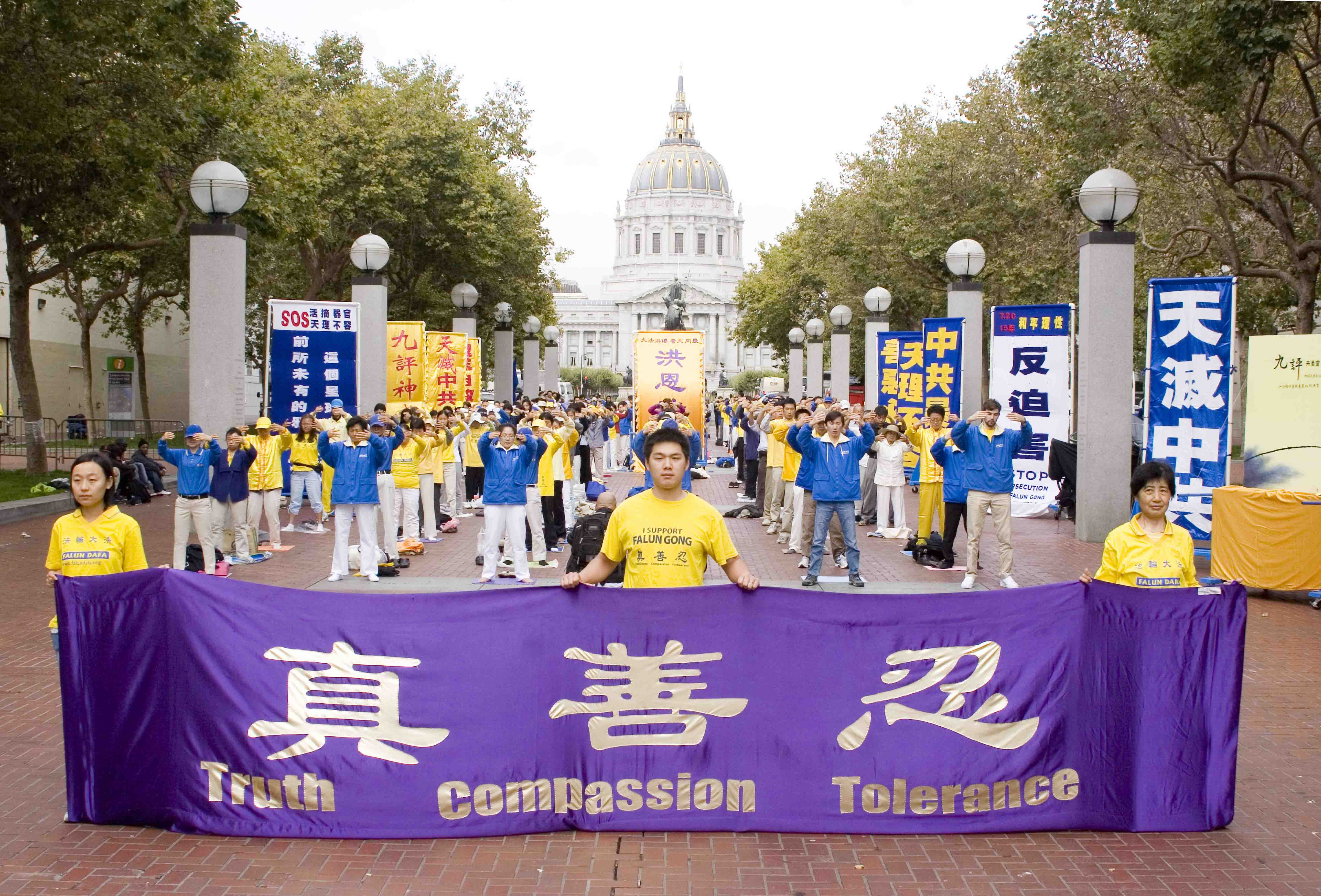 ![]() 图1:法轮功学员在旧金山联合国广场集体炼功 |