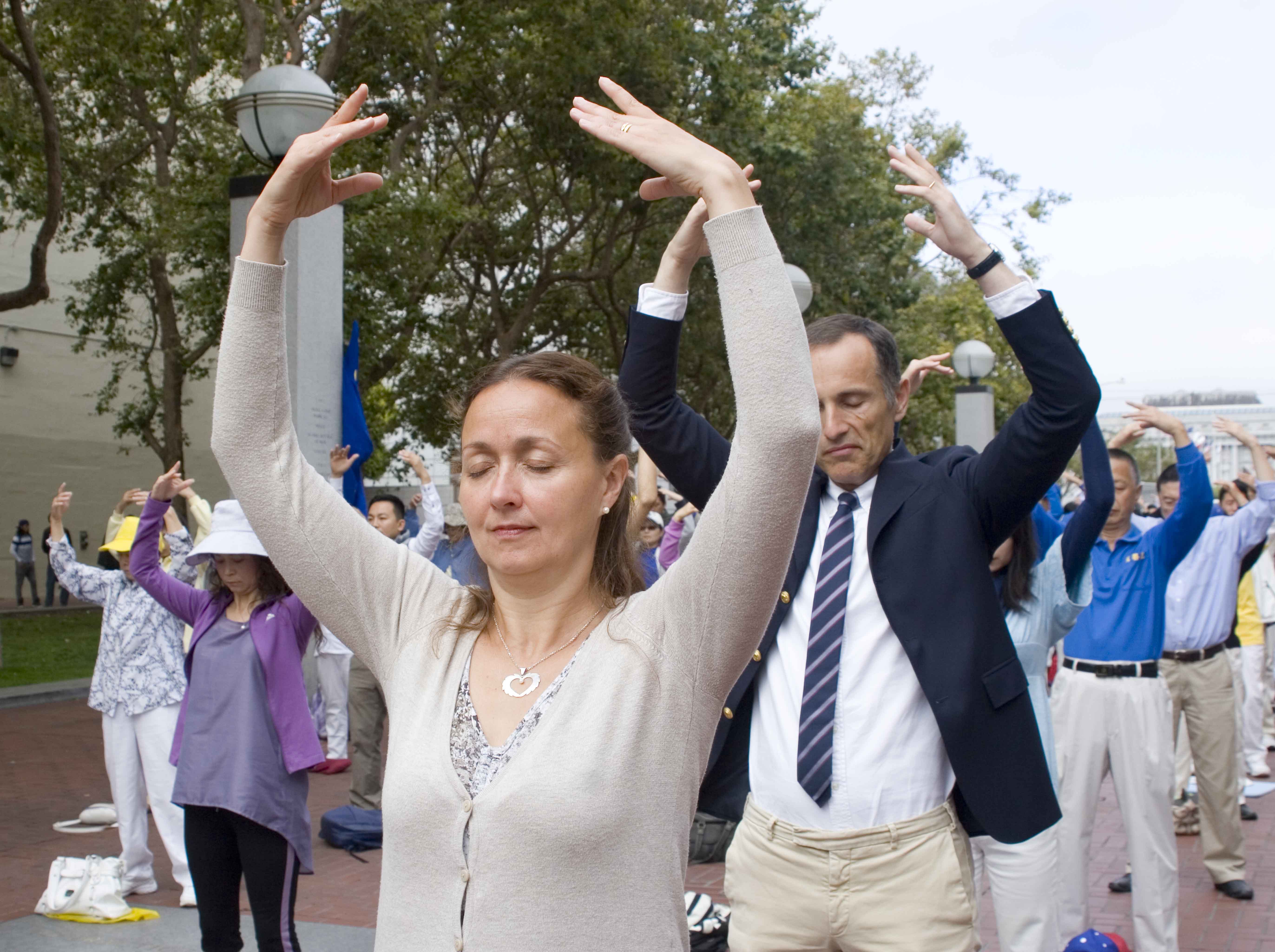 来自中国大陆的法轮功学员腊梅在集会上以亲身经历见证大法对祛病健身的奇效,并揭露中共对法轮功学员的残酷迫害。她说:“一九九七年的时候,我三十多岁,全身患有很多的病,其中包括心动过速:每分钟一百三十次,还有乙肝大三阳,白内障,甲亢(眼睛大,脖子很粗,瘦的八十多磅),咽喉炎,鼻炎,阑尾炎,胃炎等等。后来,朋友介绍学炼了法轮功,自此一身的病全好了。十年来一粒药不用吃。我的亲朋好友、同事很多人都看到我的变化,跟我一起学了法轮功。”