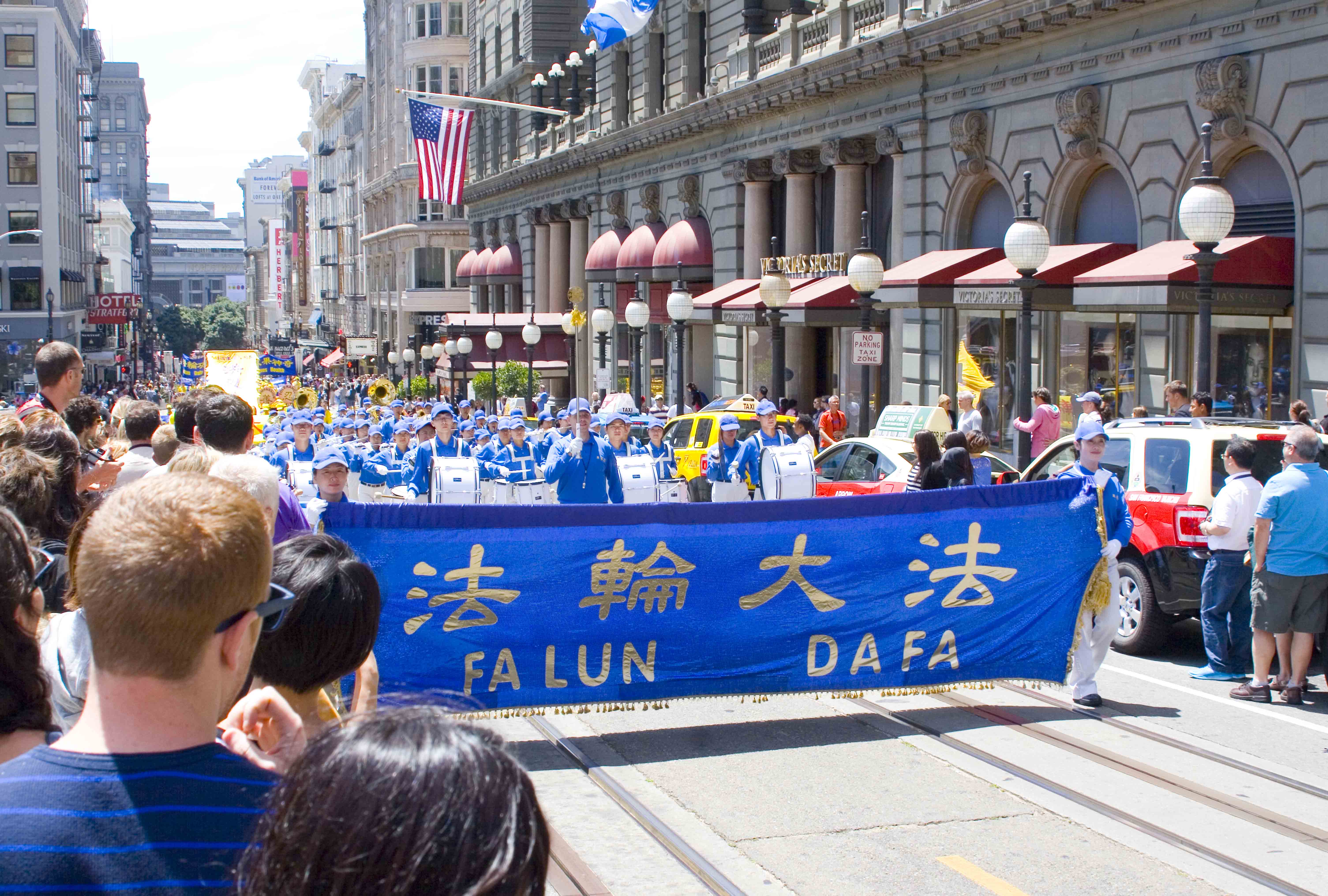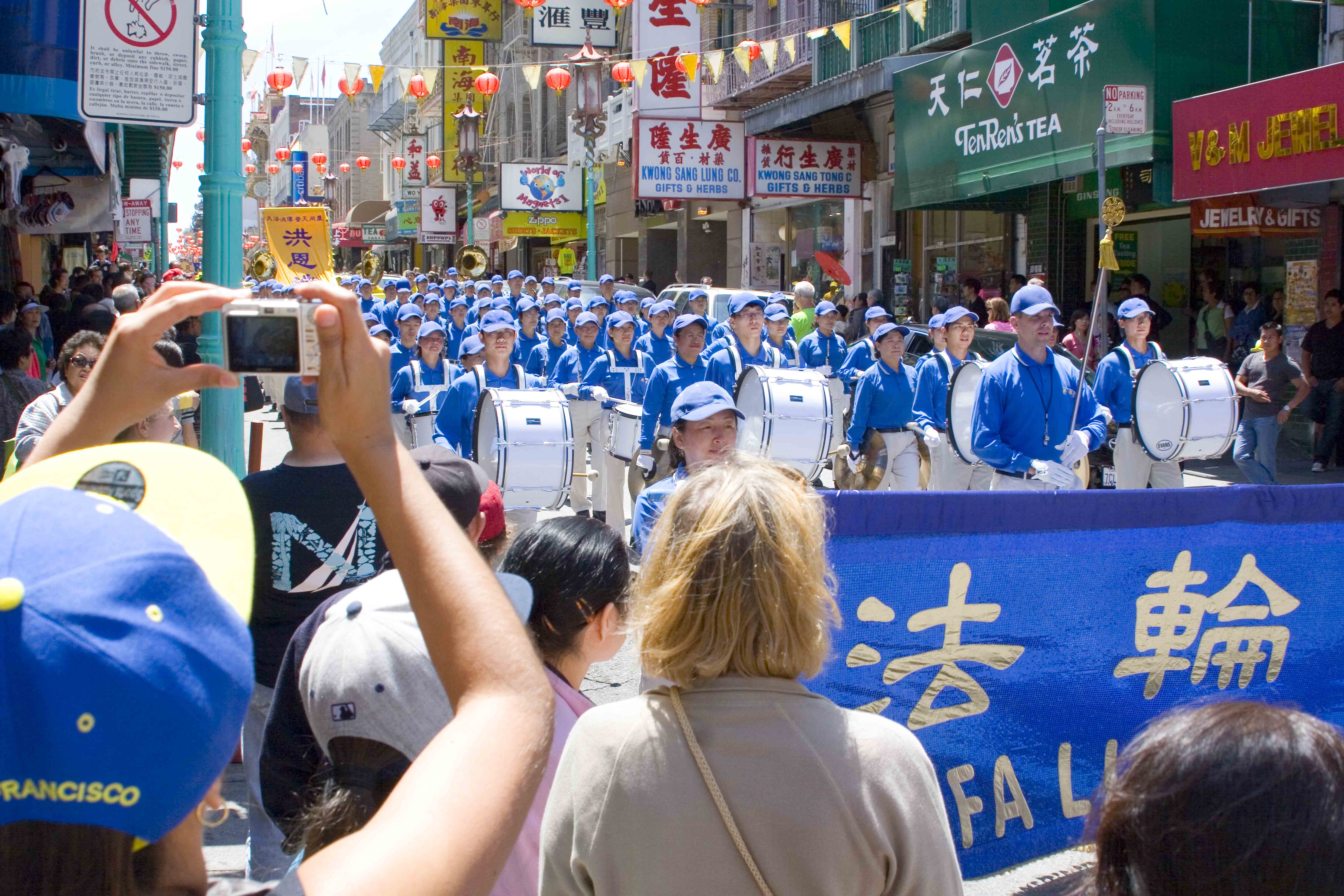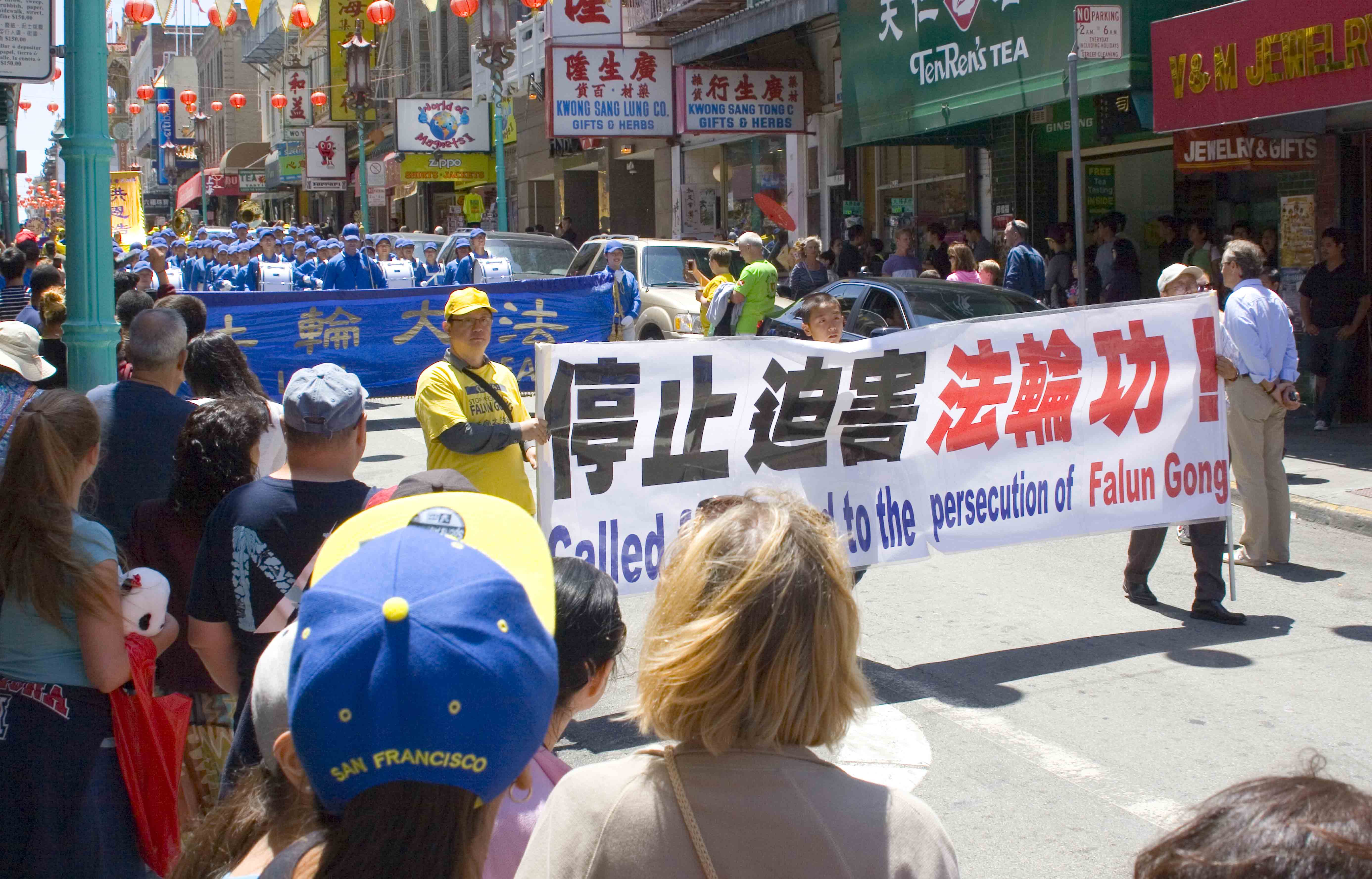 七月十九日,旧金山法轮功学员的游行队伍于中午十二点开始从位于市政厅附近的联合国广场出发,在声势浩大的美西天国乐团的引领下沿着市场街经过主要市区,再环绕中国城,最后抵达中国城花园角广场举行集会。