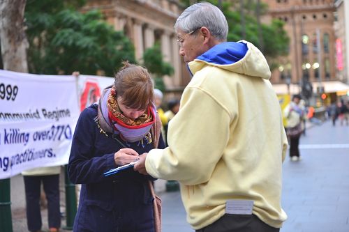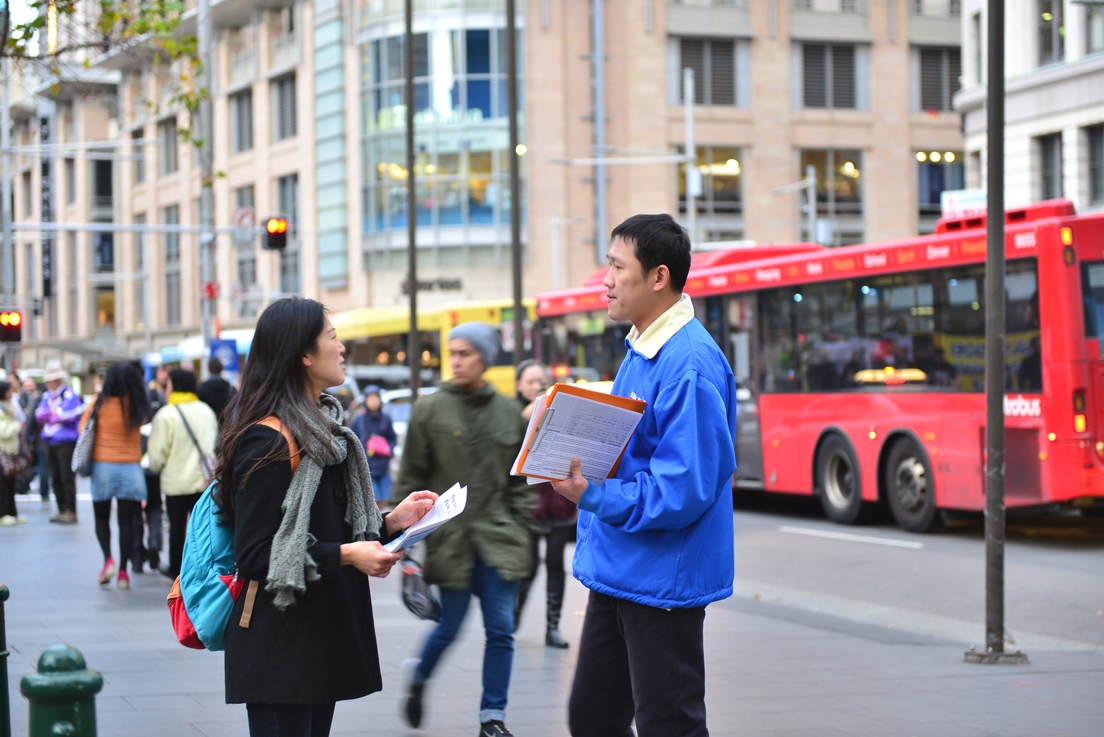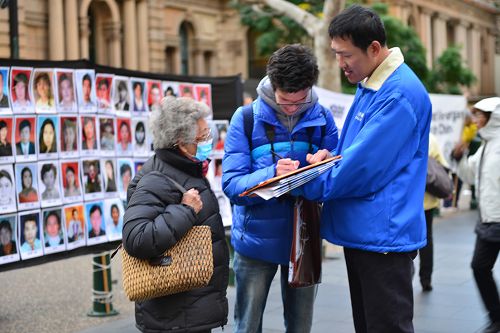继七月十六日,澳洲各地的法轮功学员在澳大利亚首都堪培拉国会山庄前举行集会,以及七月十八日在悉尼最繁华商务中心马丁广场举行真人反酷刑展,和当天举行的盛大游行一系列活动,越来越多的澳洲居民明白真相,许多上班族下班路上驻足观看,聆听真相,有的一群人或一家人一起在“帮助制止活体摘取法轮功学员器官”的征签表签名支持。还有许多大陆来悉尼读书的留学生也纷纷停下脚步了解真相,做了“三退”。