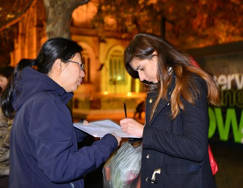 还有北京刚来悉尼工作一年的女孩,现在悉尼一中文杂志社工作,她不知道这是发生什么了,经过法轮功学员的仔细讲明真相,她也退了团后才离开。一位台湾来悉尼留学才几天的男孩,听了“中共活摘器官”的真相后,非常难过,还不太会英文的他,一个字母一个字母的努力拼写着,才把自己的地址写明了,完成了签名,支持制止在中国活体摘取法轮功学员器官的暴行。