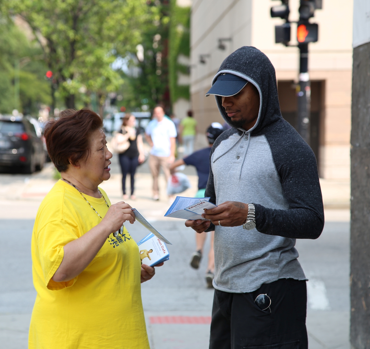 ![]() 芝加哥中领馆前,路人驻足向法轮功学员了解真相 |