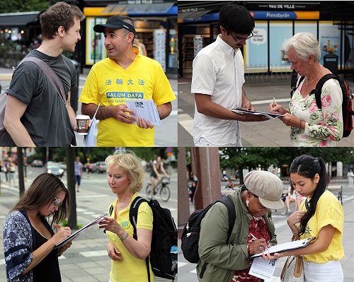 七月十八日来自瑞典各地的中西方法轮功学员聚集在首都,他们在斯德哥尔摩市中心最繁华闹市区、旅游景点向来自世界各地的民众发放法轮功真相资料、面对面讲真相劝三退(退党、退团、退队)。