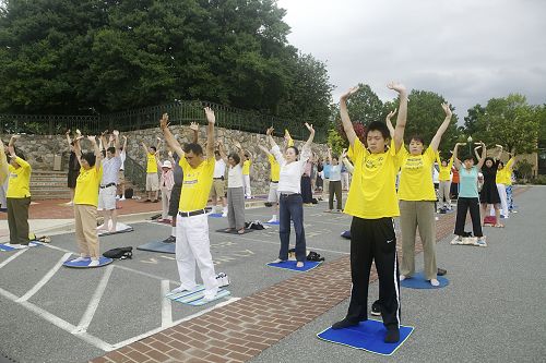七月二十日,巴黎艾菲尔铁塔下游人云集。法轮功学员在铁塔下的人权广场举行集会,悼念被中共迫害致死的大陆法轮功学员。并向来自世界各地的游客展示法轮功功法,征集签名反对活体摘取法轮功学员器官。