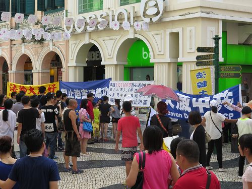二零一四年七月十九日,澳门法轮功学员于下午在玫瑰堂步行街举行集会,向澳门各界民众及大陆游客讲述法轮功真相,并协助大陆民众退出中共党、团、少先队。晚上,法轮功学员举行烛光夜悼,悼念被中共迫害致死的大陆同修。