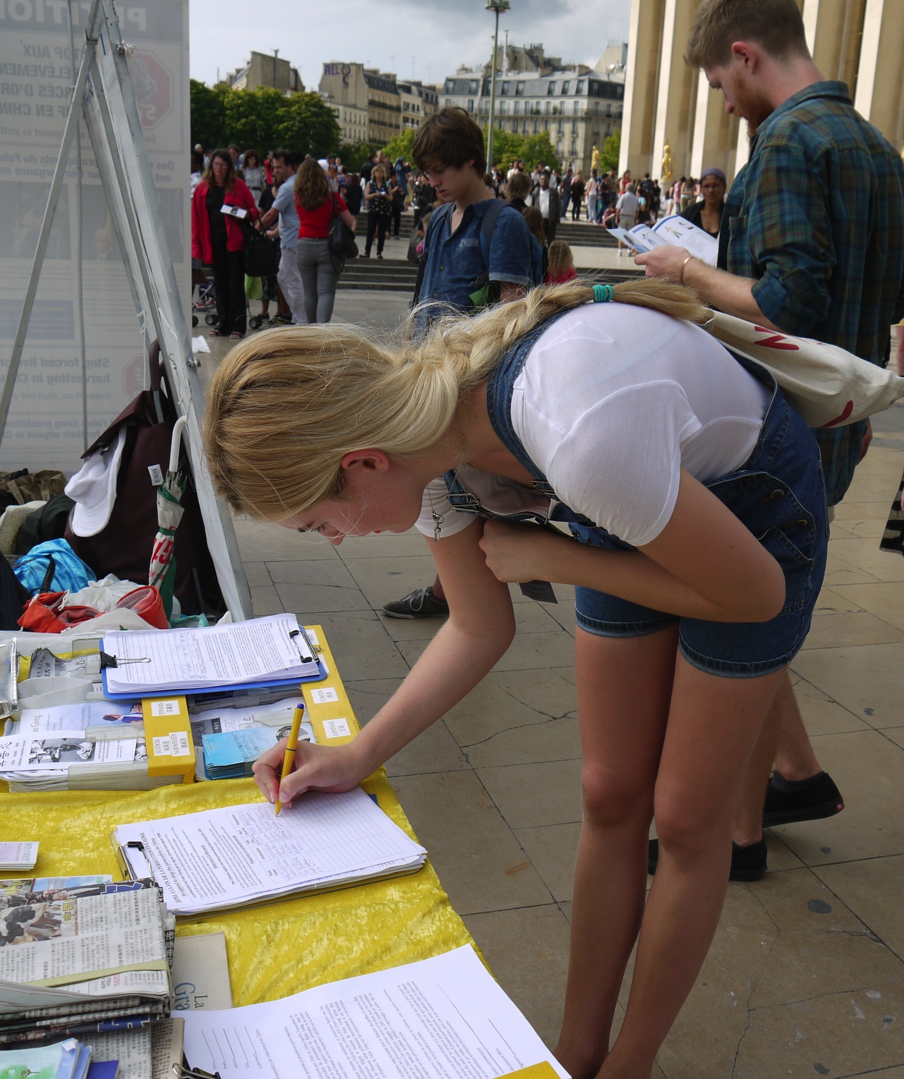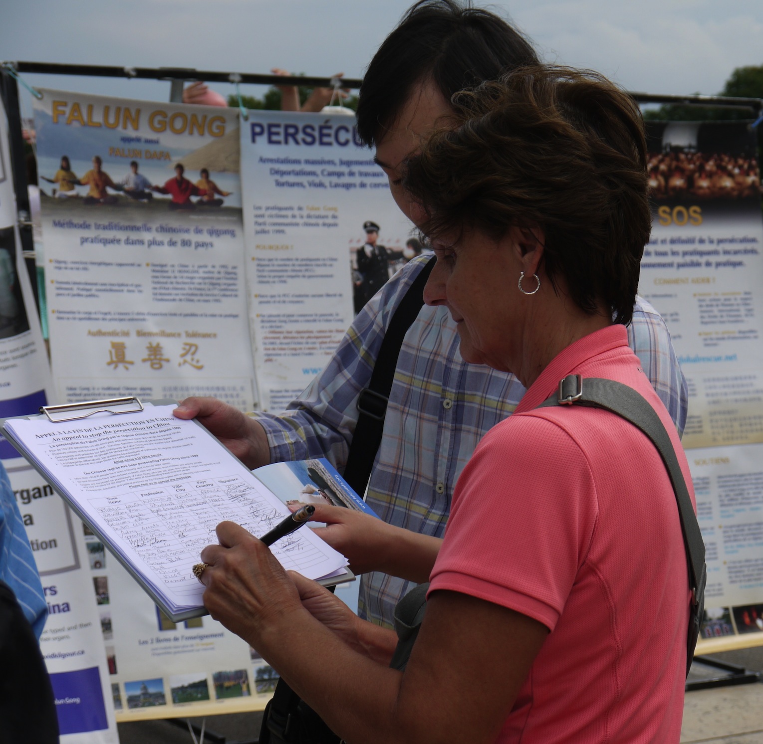 戈莱特(Colette)是小学教师,住在离巴黎一百公里的Chateau Thierry市。她和朋友相约游玩巴黎,这是他们第一次听说法轮功。当她看到展板上的迫害真相,法轮功学员被活体摘取器官时,她震惊的说不出话来,眼里含着泪水,不敢相信这是真的。她和她的朋友们都在征签表上签下了自己的名字,临别时对法轮功学员说:“谢谢你们在这里揭露中共罪行,让我们了解了这一事实”。